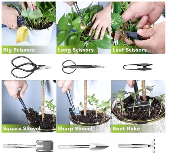 Набір інструментів для бонсай Preciva містить 13 різних інструментів і підходить для різноманітного садівництва, бонсай, квітів, невеликих рослин тощо. До нього входить набір секаторів для бонсай, невеликий набір лопатки для бонсай, дроту для бонсай і сумки для зберігання.