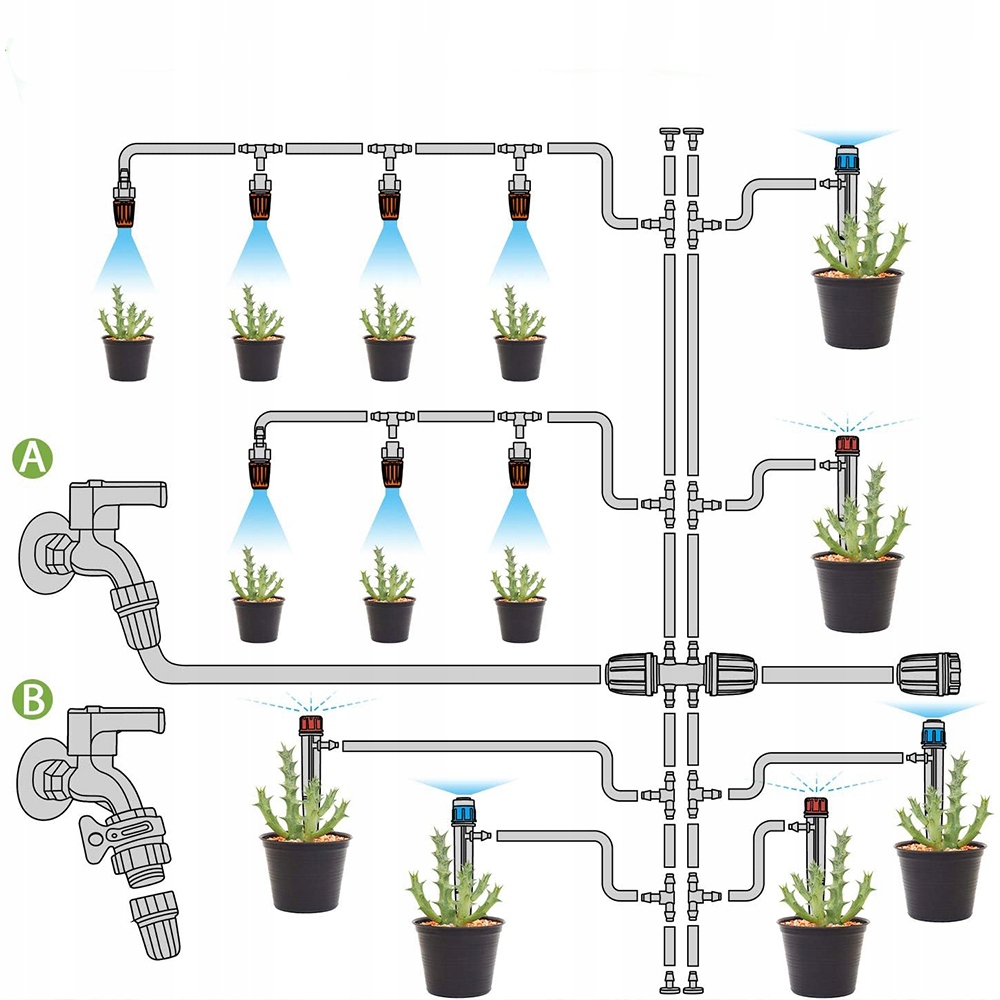 Крім функції крапельного зрошення, ця система також має функцію дощування, що підходить для теплиць і рослин у теплицях. Дрібний водяний туман може підвищити вологість повітря, створити вологе середовище для рослин і сприяти здоровому росту.