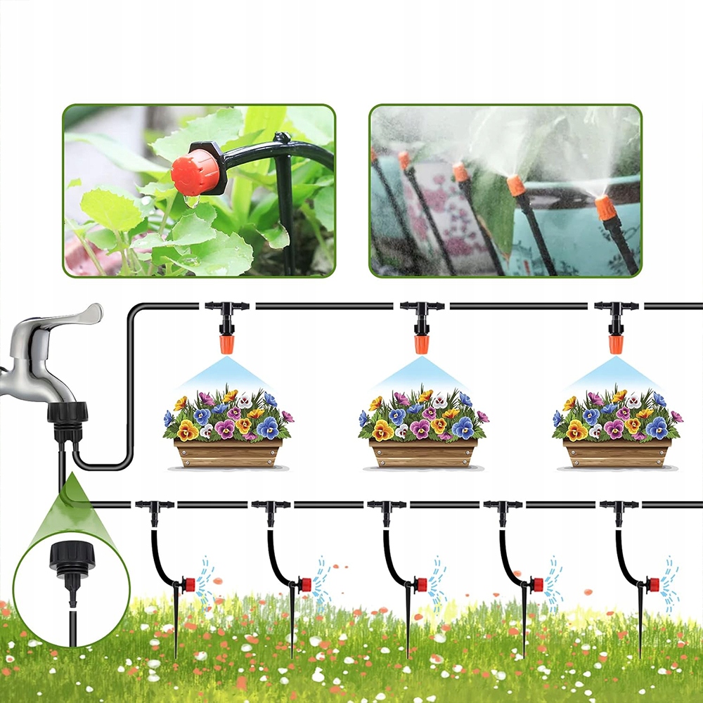 Настроюваний режим зрошення: Набір для крапельного зрошення містить 3 типи регульованих насадок, які можна використовувати для мікрокрапельного зрошення або обприскування відповідно до потреб різних рослин. Крім того, кожне зрошувальне сопло знімається, що дозволяє легко чистити, не турбуючись про засмічення.