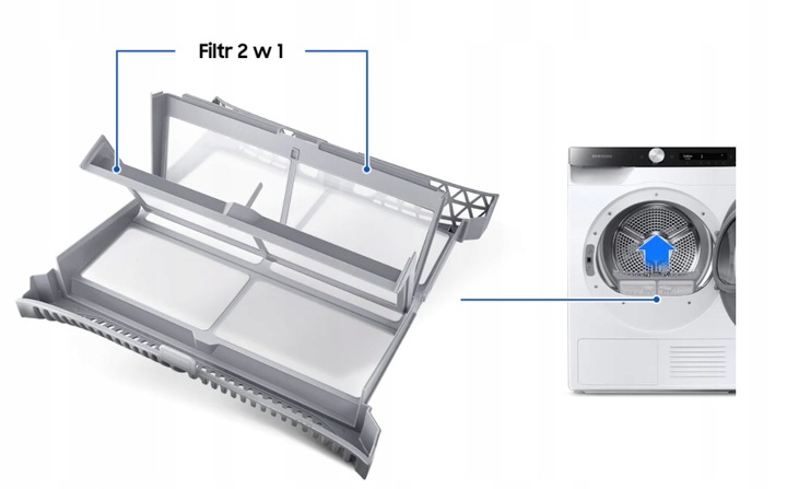 Подбайте про свою сушильну машину в простий і зручний спосіб. Інноваційний фільтр 2-в-1 оснащений двома шарами сітки, які вловлюють пил і волокна. Це рішення усуває необхідність використання фільтра теплообмінника, що полегшує утримання пристрою в чистоті та забезпечує оптимальну ефективність сушіння. Крім того, спеціальна сигналізація повідомить вас, коли фільтр потрібно почистити
