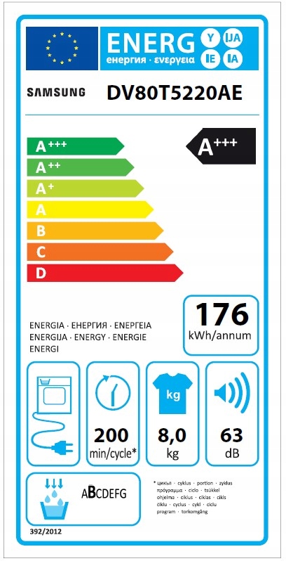 НАЙВАЖЛИВІШІ ПАРАМЕТРИ СУШИЛЬНОЇ МАШИНИ DV80T5220AE 8 кг, тепловий насос A+++