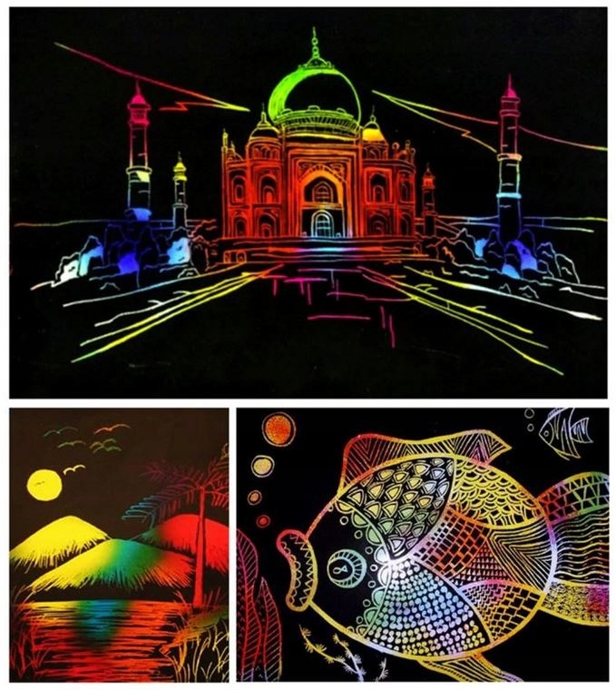 Це допоможе вашій дитині розвинути творчі здібності та ручні навички. Це буде чудовою альтернативою звичайному малюванню олівцями. Гра включає в себе дряпання верхнього чорного покриття для створення малюнка. Малюк має необмежені можливості у створенні форм і малюнків, які, безумовно, будуть набагато цікавішими за стандартні.