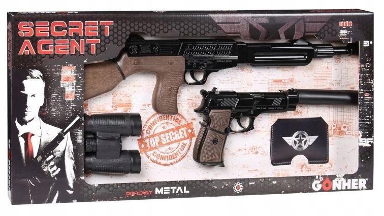 До набору входять: металева гвинтівка та 8-ми патронний пістолет з магазином, бінокль та посвідчення секретного агента. Вік: 3+.
