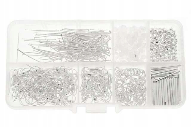Тип елемента амбушури, ланки, кульки, накладки, шпильки, баранчики Колір - сріблястий Розмір - мікс Кількість - 600 шт. Все упаковано в практичний закритий органайзер.