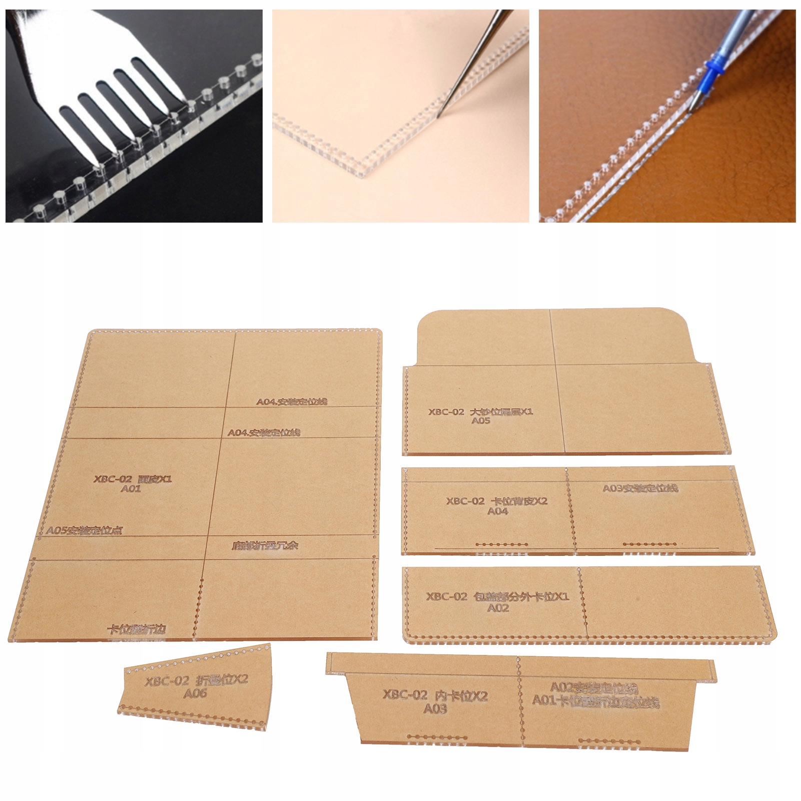 1. Форма прозора і прозора, зручна в зберіганні і може використовуватися протягом тривалого часу. 2, високоякісний акриловий матеріал, міцний і прозорий інструмент для точного різання. 3, малюнок прозорий, що дуже зручно для вирізання шкіряних візерунків. 4. Викрійка покрита крафт-папером для запобігання зіткнень і подряпин при транспортуванні. 5. Ці акрилові трафарети можуть допомогти вам створити персоналізований і красивий гаманець.