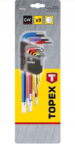Набір шестигранних ключів TOPEX (код 35D966) містить 9 гайкових ключів розміром від 1,5 до 10 мм із міцної хромованадієвої сталі. Кожен розмір гайкового ключа має кольорове кодування, що дозволяє легко швидко вибрати правильний розмір під час роботи. Все упаковано в практичну упаковку. Торгова марка TOPEX орієнтована на любителів робити сам.