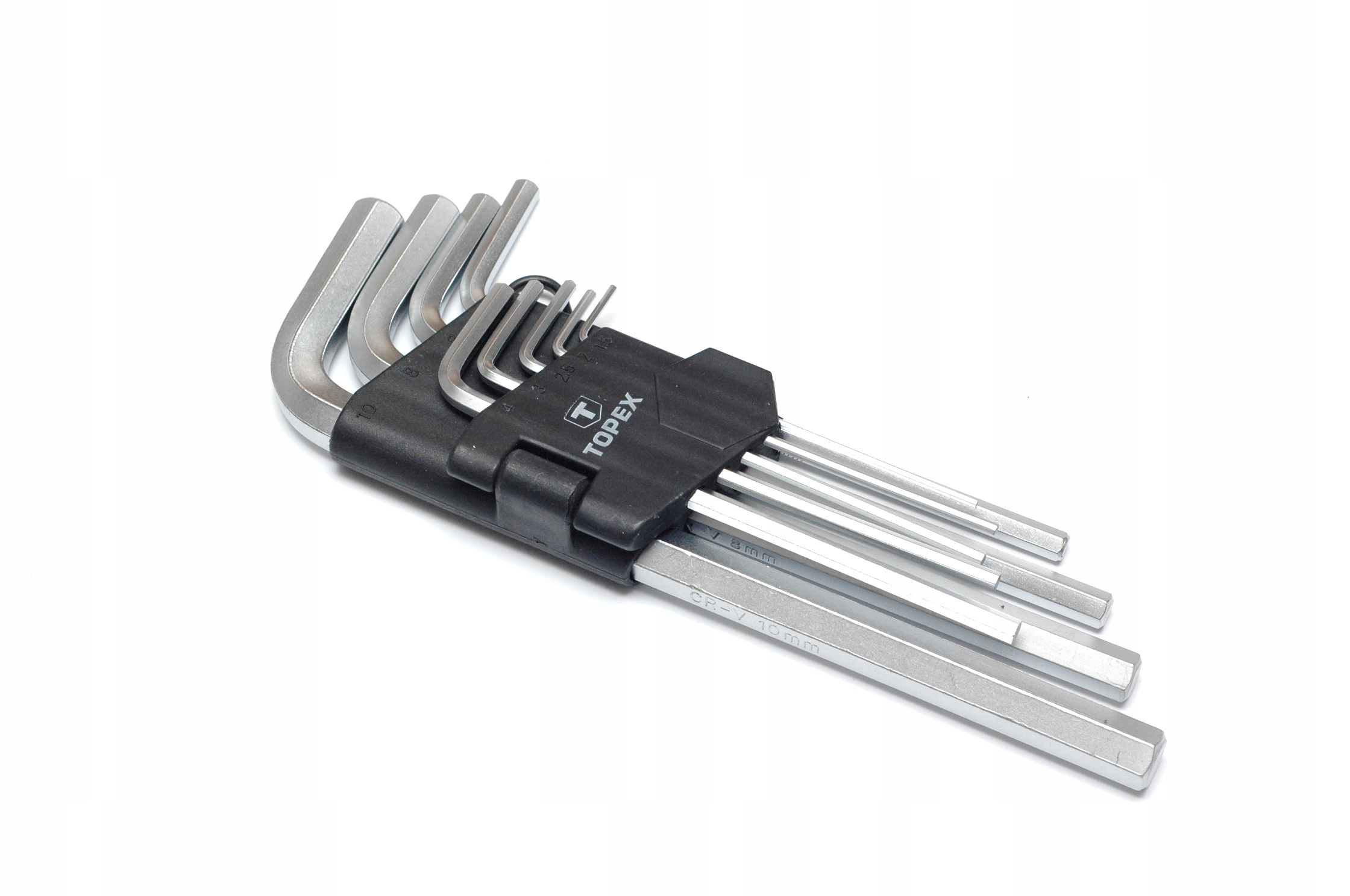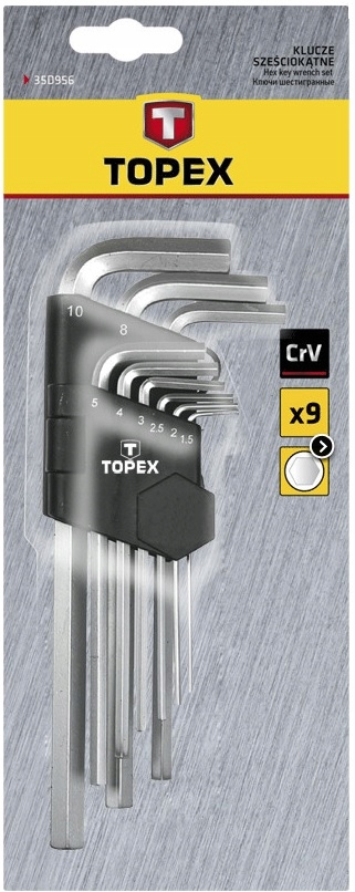 Довгі шестигранні ключі TOPEX розміром 1,5-10 мм. Виготовлений з міцної хромованадієвої сталі, що забезпечує тривалий термін служби виробу. Практична пластикова упаковка з позначеним відділенням для кожного ключа полегшує їх зберігання.