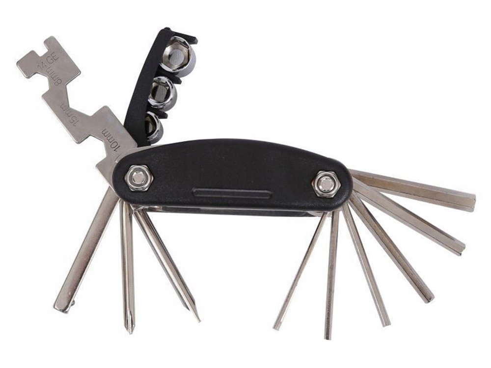Набір велосипедних ключів містить 16 найважливіших інструментів для регулювання та ремонту велосипеда. У набір входять шестигранні ключі, викрутки, головки з перехідником, ріжкові ключі та спеціальний ключ для спиць.