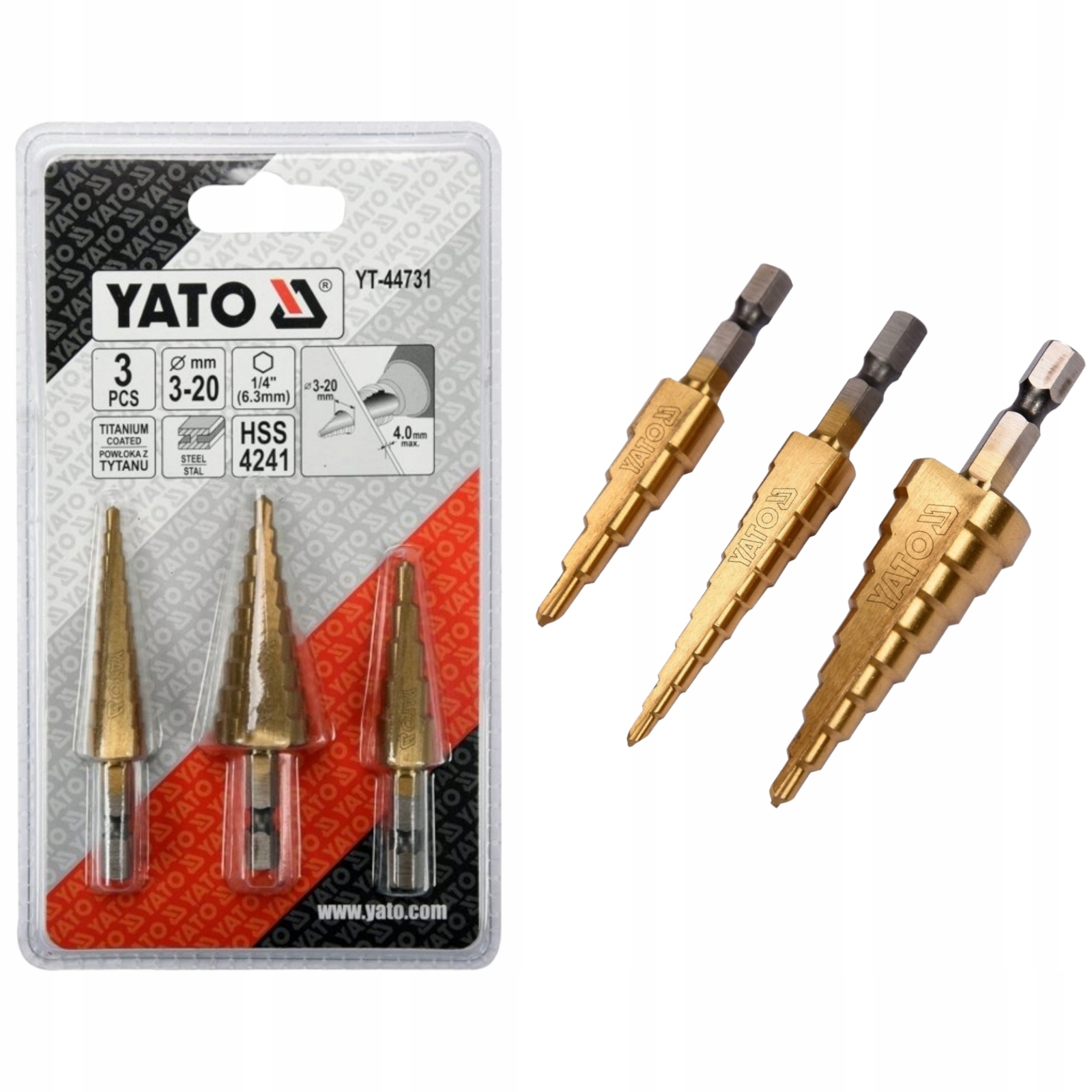 Набір ступінчастих свердел YATO YT-44731. Призначений для свердління високоякісної нержавіючої сталі, конструкційної та холоднокатаної сталі, кольорових металів, листової сталі та пластику. • виготовлений зі швидкорізальної сталі HSS 4241, покритий нітридом титану для підвищення довговічності свердел • краї просвердленого отвору залишаються чистими і без задирок • автоматичне центрування на округлих і слизьких поверхнях • швидке розсіювання тепла при свердлінні твердих матеріалів • 2 спіральні канавки ефективно видаляють матеріал свердла