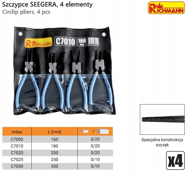 Набір містить 4 шт. плоскогубців, призначених для встановлення/зняття кілець Seeger.