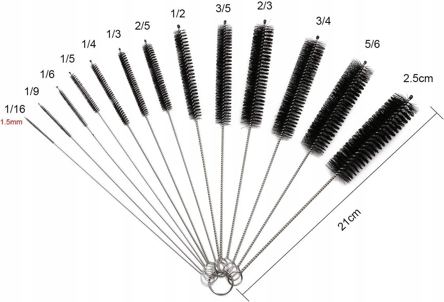 - Набір містить 13 пензликів різного діаметру, тож ви можете легко вибрати потрібний для будь-якого завдання - від дуже тонких трубочок до більш широких пляшок.