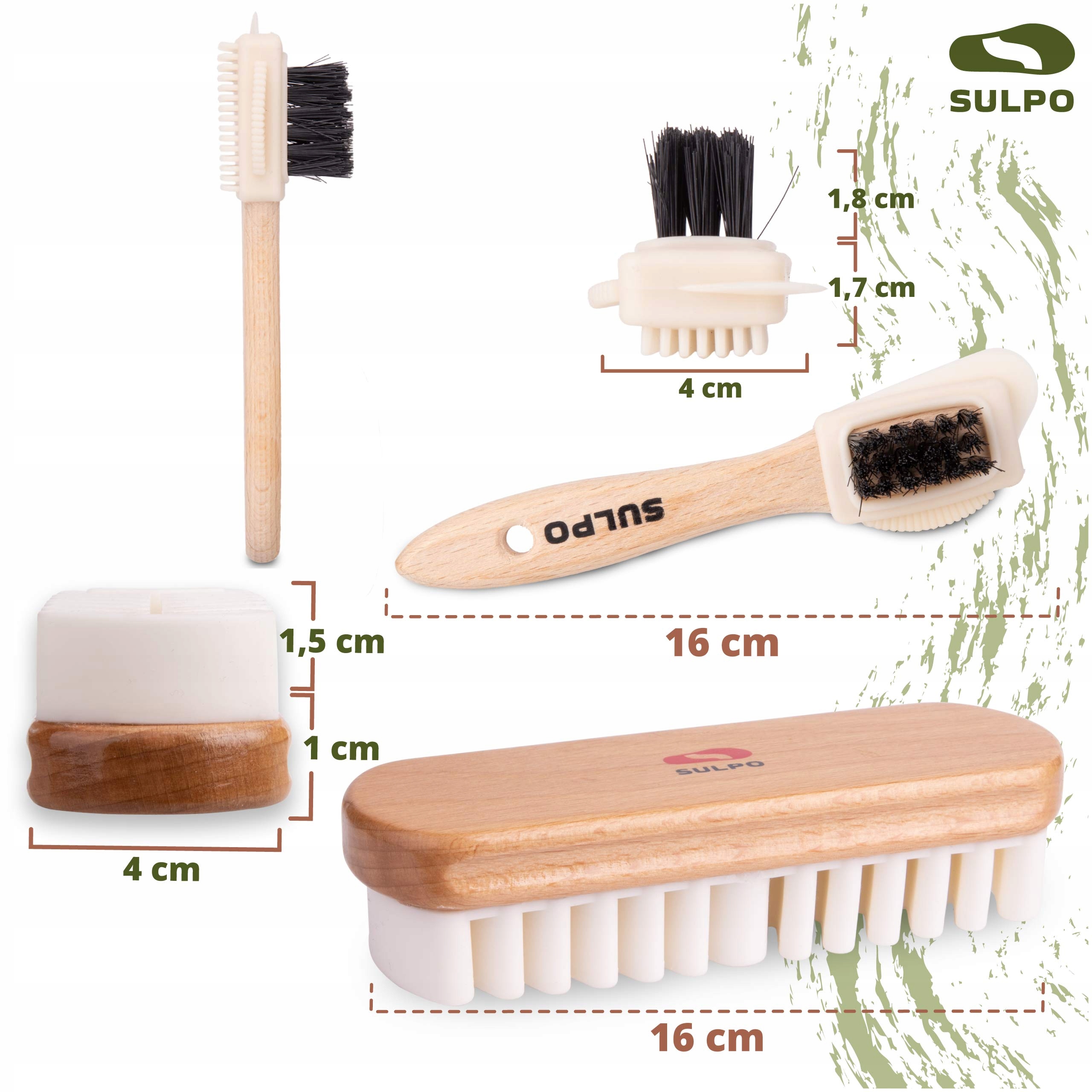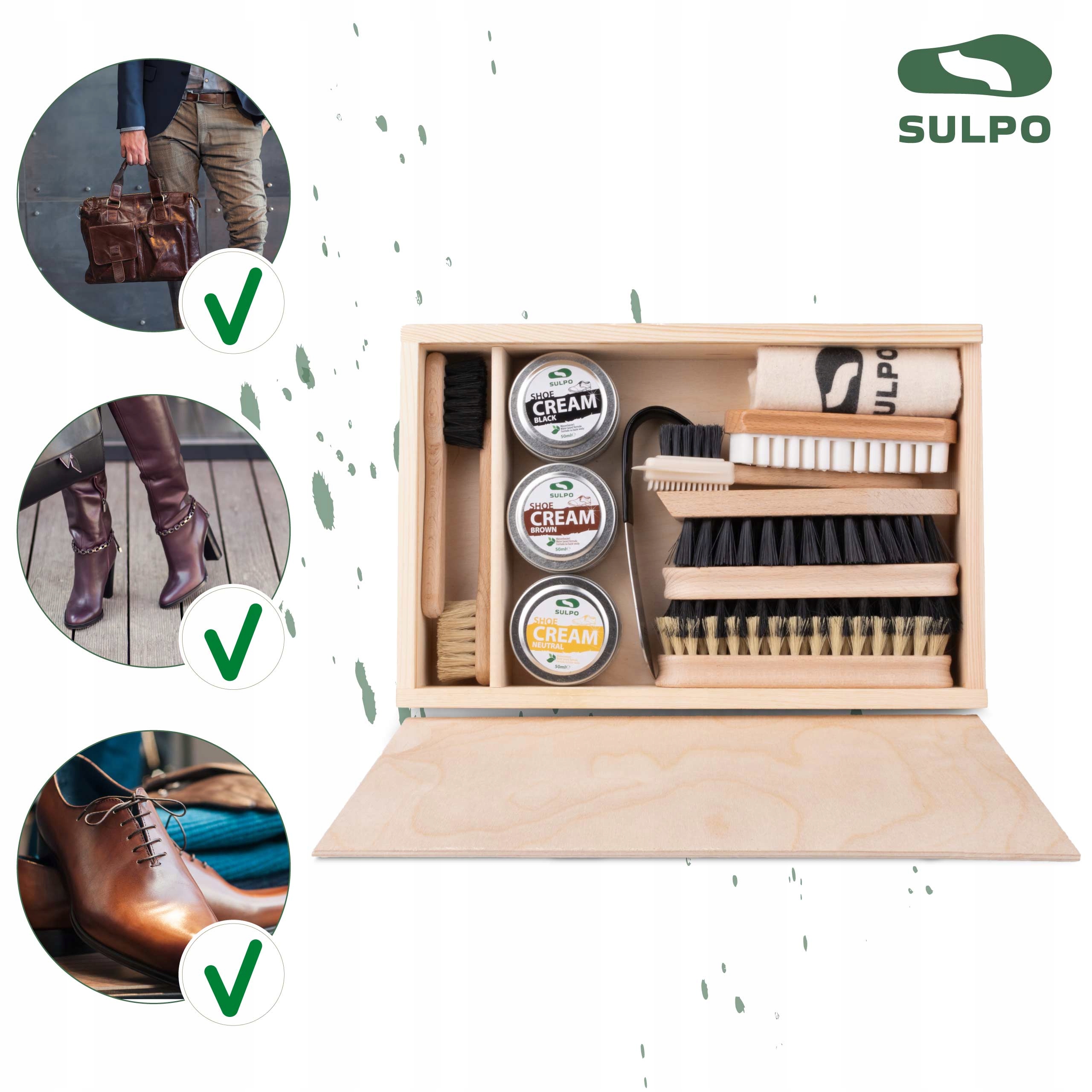 З набором SULPO ваше взуття завжди виглядатиме як нове. Не чекайте, щоб додати цей набір до своєї колекції взуттєвих аксесуарів і насолоджуватися первозданним виглядом свого взуття протягом багатьох років. Якість і елегантність в одному комплекті.