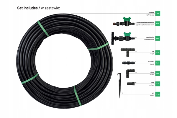 - набір включає крапельний шланг і 87 елементів, що дозволяє вільно розташовувати шланг