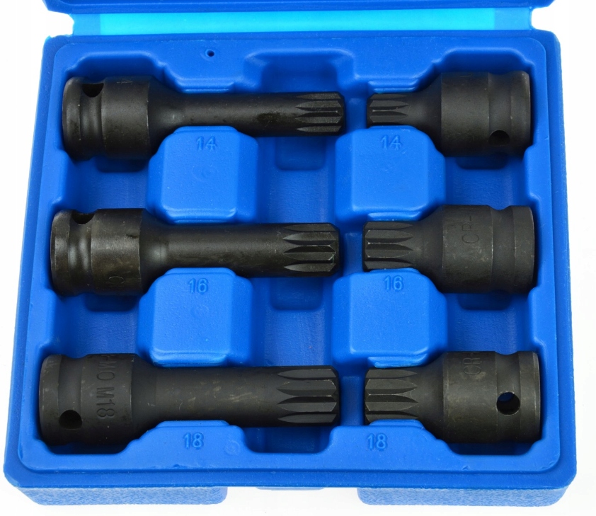 Набір шліцевих ударних гайкових ключів, які використовуються в автомобілях VAG, включаючи VW LT, Transporter, Golf і Sharan, а також задніх гальмівних супортах Porsche Cayenne