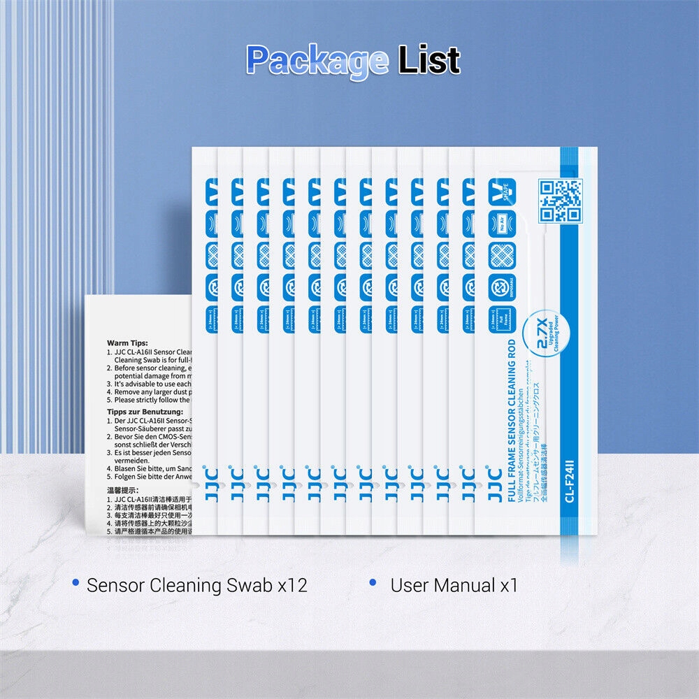 Універсальне рішення для очищення: відчуйте унікальну здатність тампона для очищення сенсора безпечно й ефективно очищати повнокадрові сенсори CCD і CMOS. Це стосується не лише датчиків; делікатні поверхні, такі як смартфони, клавіатури, РК-екрани, лінзи та окуляри, також виграють від його ніжного дотику. Покращена потужність очищення: будьте готові до покращеного очищення! Ця нова версія пропонує в 2,7 рази більшу потужність очищення, ніж її попередник, забезпечуючи покращений досвід очищення та надзвичайні результати. Вакуумно запечатаний: кожен чистячий шпатель (тампон) ретельно запечатаний вакуумом. Довіряйте високим стандартам чистоти, готуючи камеру та пристрої для оптимальної роботи! Ідеальна мікрофібра: кінчик чистячої подушечки загорнутий у високоякісну тканину з мікрофібри, яка ефективно видаляє пил і бруд, не залишаючи слідів і подряпин. Точна конструкція: ширина 24 мм, що ідеально відповідає розмірам повнокадрового датчика, чистяча подушечка забезпечує повне й точне очищення, ефективно видаляючи пил і плями з поверхні сенсора. Розумна V-подібна конструкція підвищує ефективність, водночас дбайливо ставлячись до датчика. Паличка для очищення датчиків JJC була спеціально розроблена, щоб забезпечити безпечне та ефективне рішення для очищення повнокадрових датчиків CCD і CMOS. Його універсальність поширюється на делікатні поверхні пристроїв, такі як смартфони, клавіатури, РК-екрани, лінзи та окуляри. Містить 12 окремо запакованих тампонів для чищення сенсора. Ця покращена версія пропонує в 2,7 рази більшу потужність очищення, ніж її попередник, забезпечуючи чудовий досвід очищення.