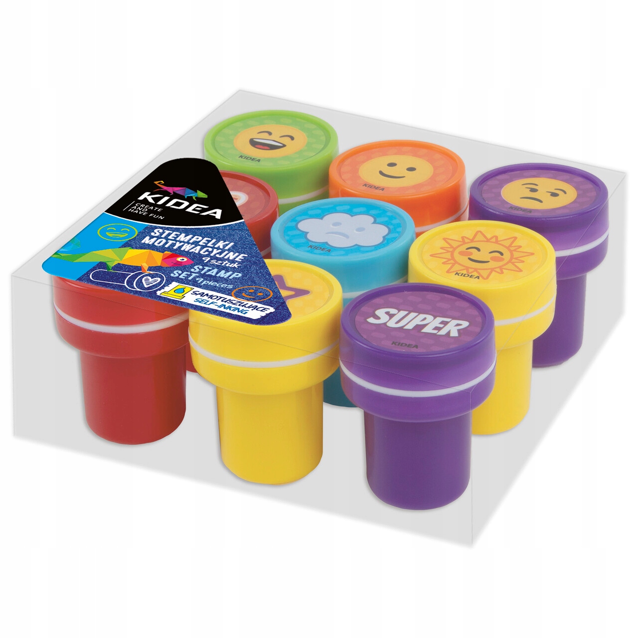 Штампики для дітей з мотивуючими смайлами від Kidea. У набір входить цілих 9 штампів різних кольорів: жовтий, оранжевий, червоний, зелений, синій і фіолетовий.