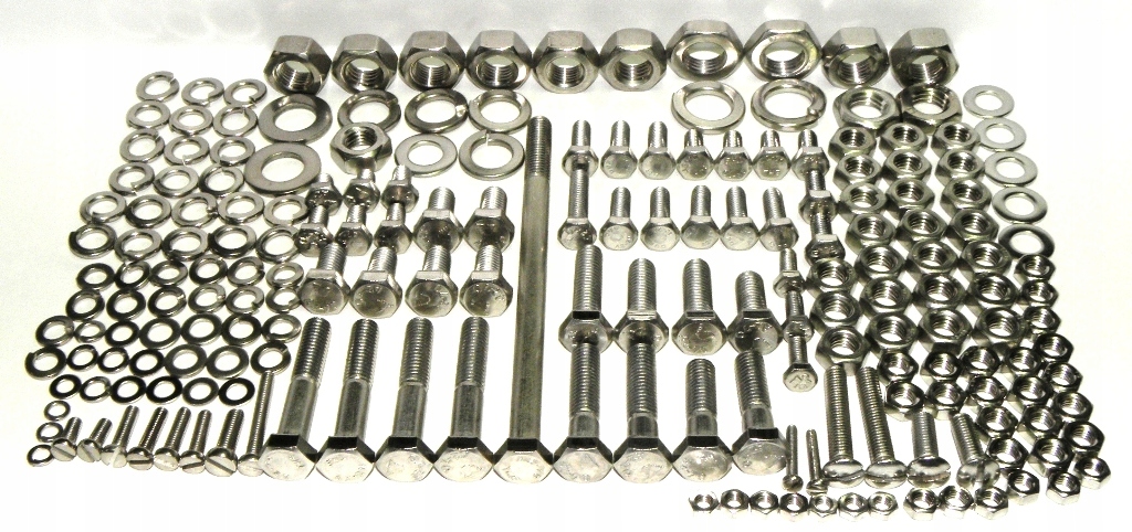 Набір складається з елементів з хромонікелевої нержавіючої сталі, виготовлених у класі A2 70. Набір включає гвинти, гвинти, гайки та шайби, розділені на 16 окремо упакованих груп, що забезпечує безпроблемне складання окремих елементів мотоцикла. У групі ПЕРЕДНЯ ВИЛКА додані гайки з різним кроком різьблення для кріплення підвіски у зв'язку з наявністю 2-х типів різьби в підвісці мотоцикла WFM M06.