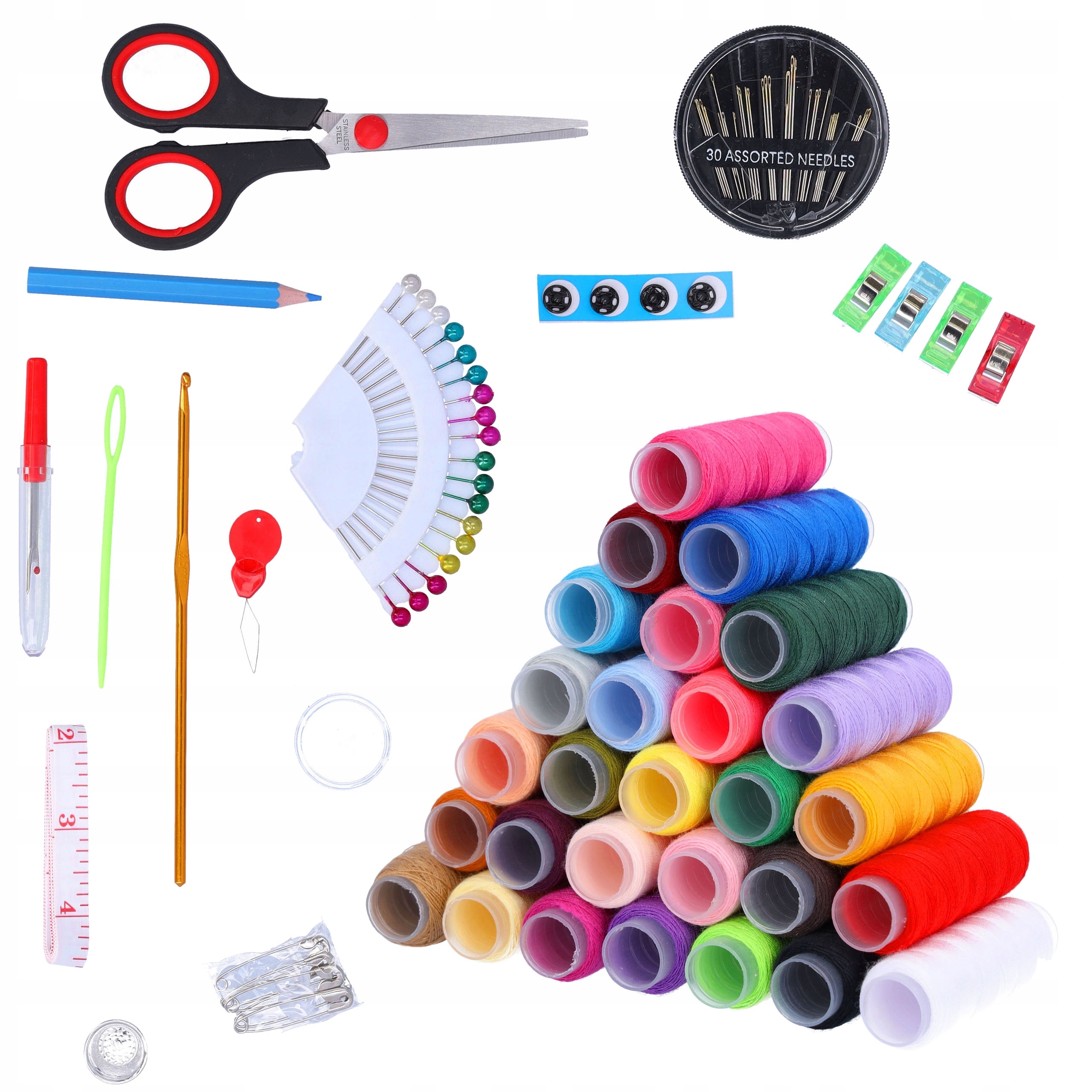 Набір містить 30 ниток різних кольорів, що дозволяє підібрати його до будь-якого типу матеріалу та кольору одягу, що надзвичайно корисно як у повсякденному ремонті, так і в більш складних проектах.