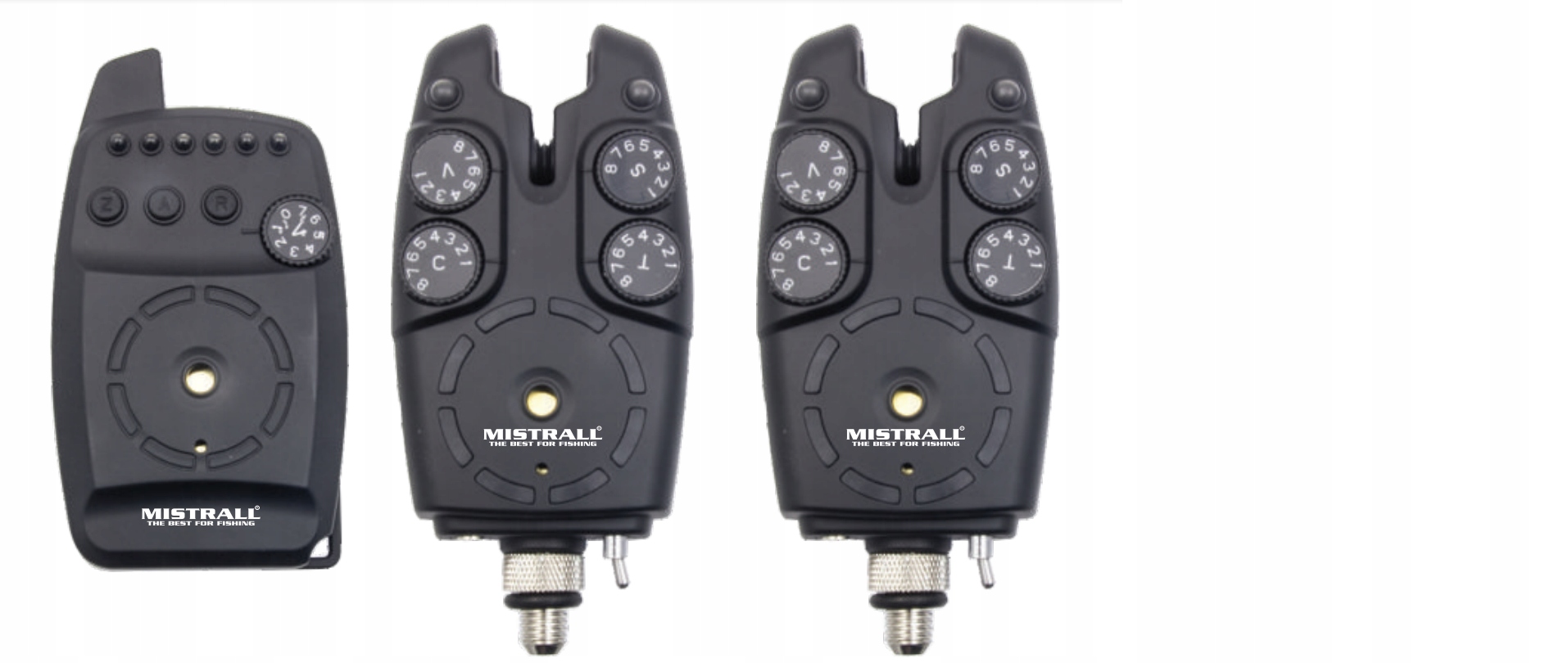 Бездротовий водонепроникний блок керування верхньої полиці від відомої та шанованої компанії Mistrall, що містить 2 індикатори та блок керування, у якому можна налаштувати до 6 різних кольорів. Звукова, світлова та вібраційна сигналізація. Сигналізації мають регулятори гучності, чутливості та тембру, мають пам'ять укусів, оснащені виходами для свінгерів, додатково прогумовані для запобігання вологи. Блок управління живиться від маленьких батарейок типу ААА (1,5 В х 3 шт.), а сигналізації від батарейок 9 В по 1 шт. для кожного, завдяки чому було отримано найкраще співвідношення енергоефективності та радіусу дії бездротового зв’язку. Набір упакований в елегантну валізу, оббиту протиударною губкою. Блок управління дійсно виглядає приголомшливо!!!