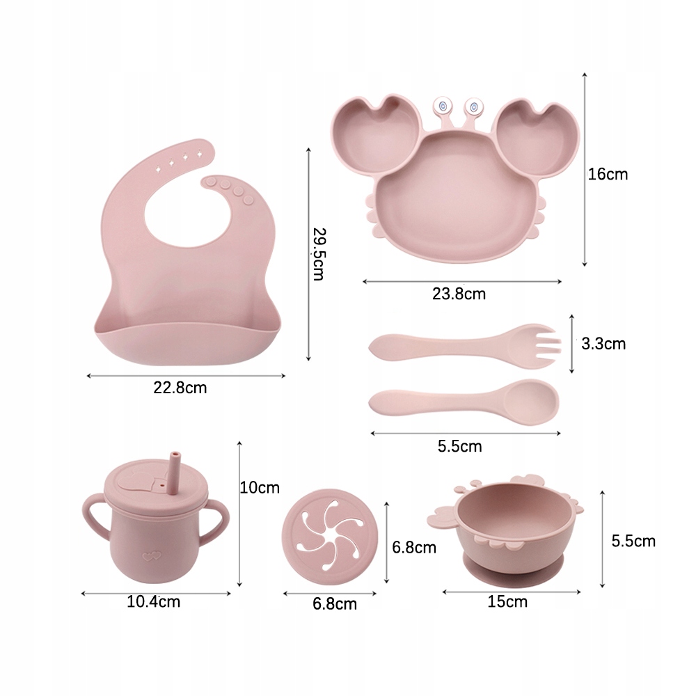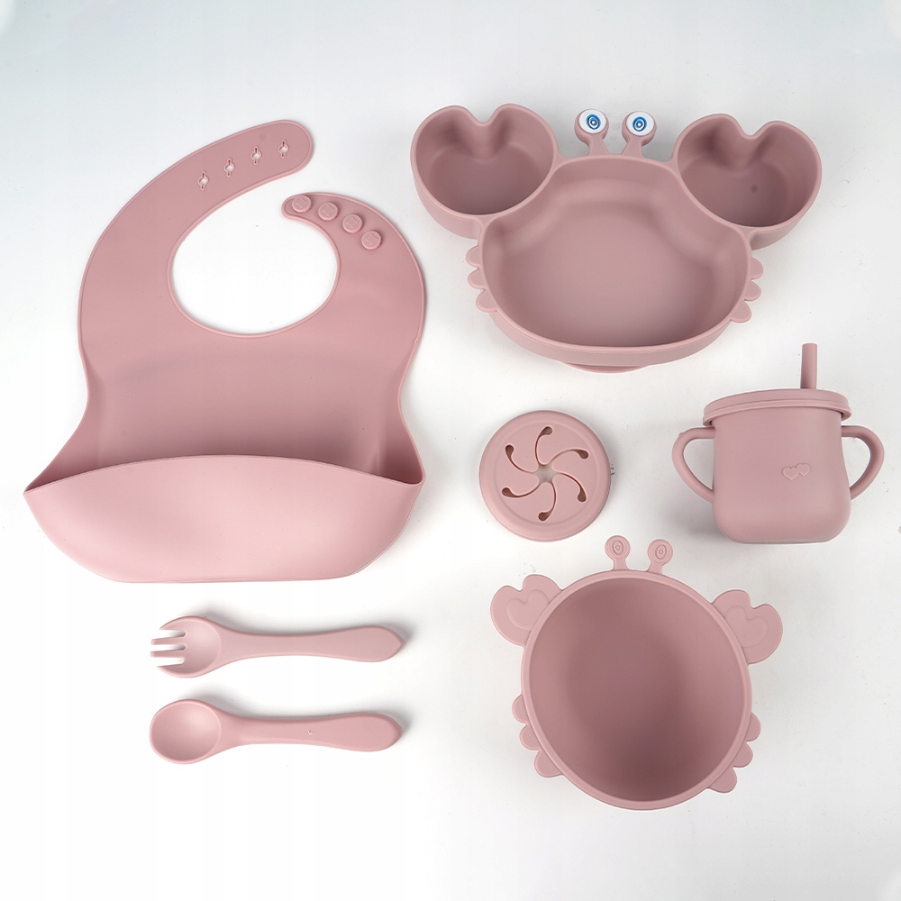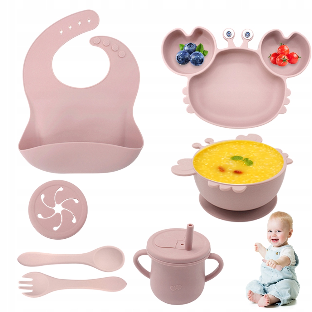 ⭐СИЛІКОНОВИЙ ПОСУД НАБІР ДЛЯ ГОДУВАННЯ КРАБОМ ДЛЯ ДІТЕЙ З ПРИСОСОЮ 8 EL PINK⭐