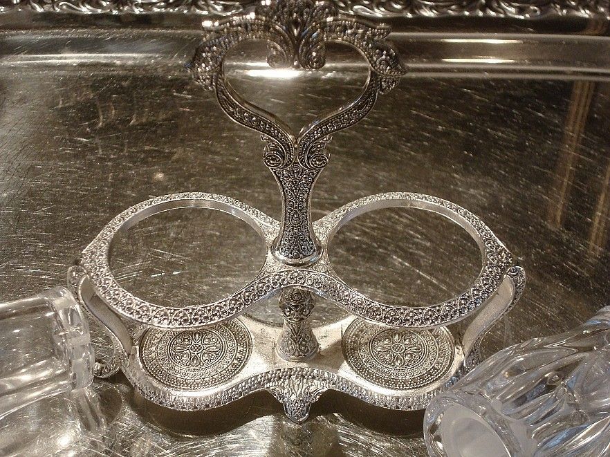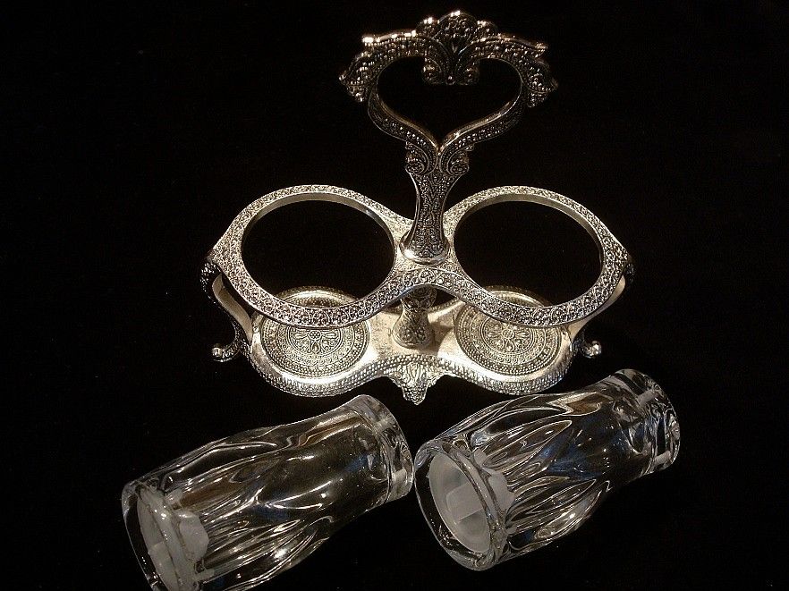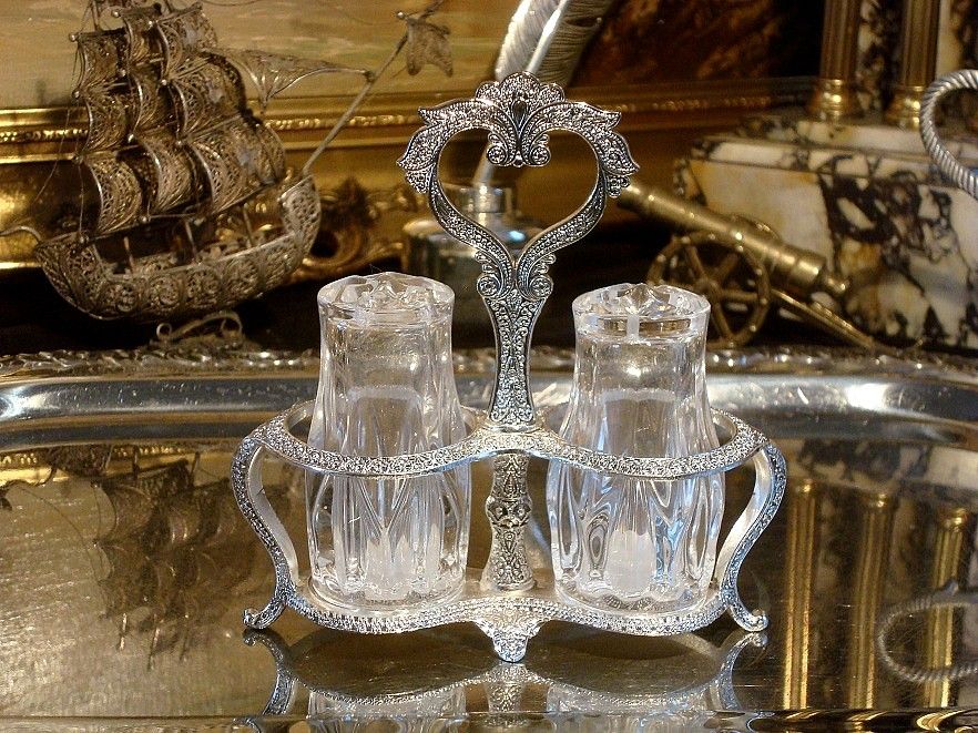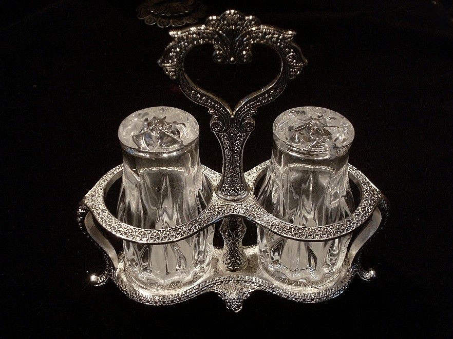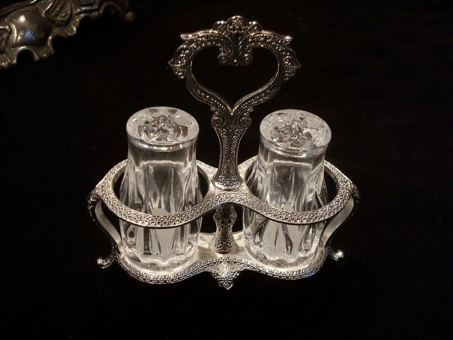 Запрошую придбати надзвичайно ефектний, декоративний набір, який складається з сільнички, перечниці та красивої рамки, фантастично прикрашеної східними мотивами. Контейнери скляні, рама з кольорового металу, покрита СРІБЛОМ. Виглядає все надзвичайно красиво.