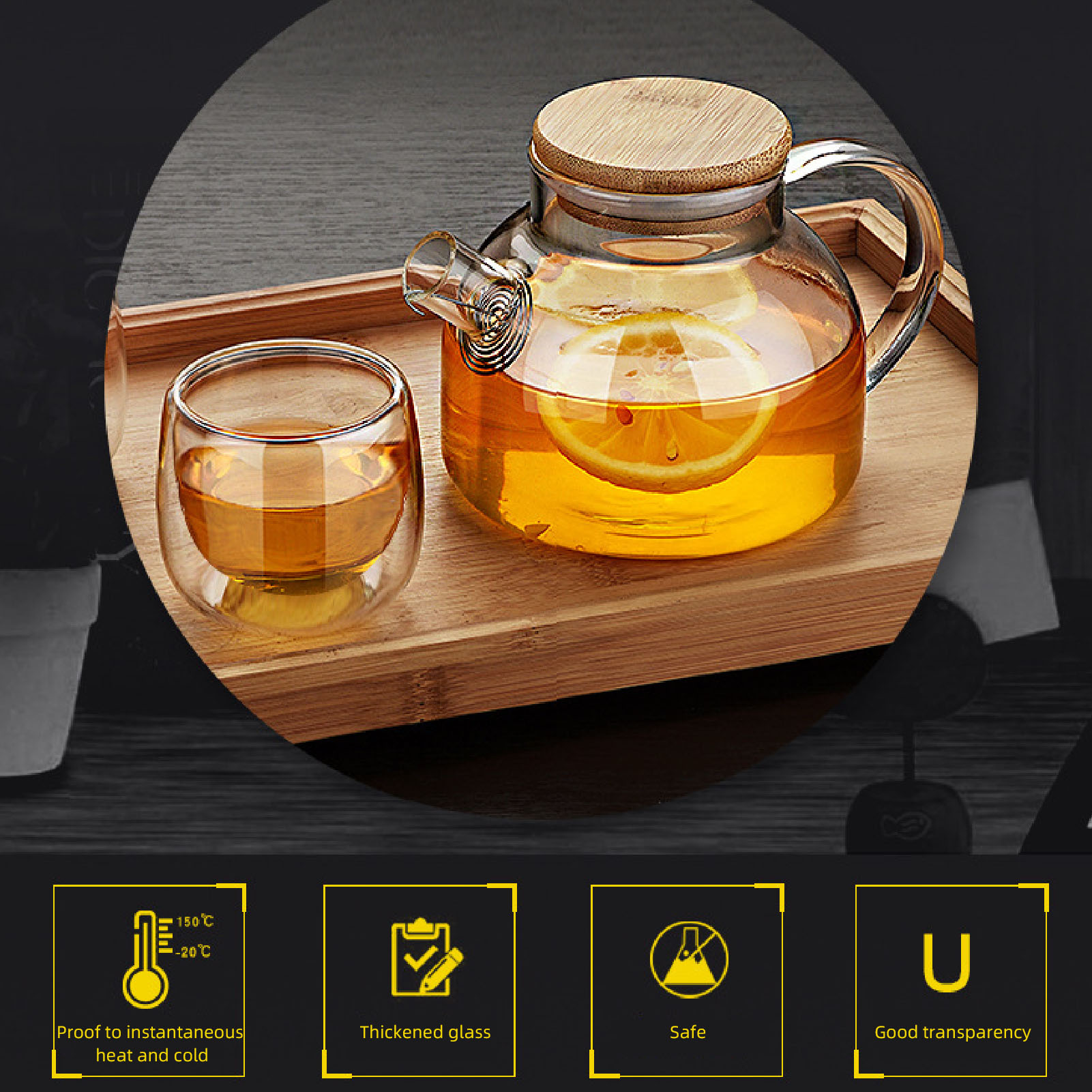 1. Високе боросилікатне скло: виготовлений із преміального високоякісного боросилікатного скла, цей набір чайників зміцнений високотемпературним запіканням, що робить його термостійким і вибухобезпечним. Його можна безпечно розігрівати на відкритому вогні або електричній керамічній плиті.