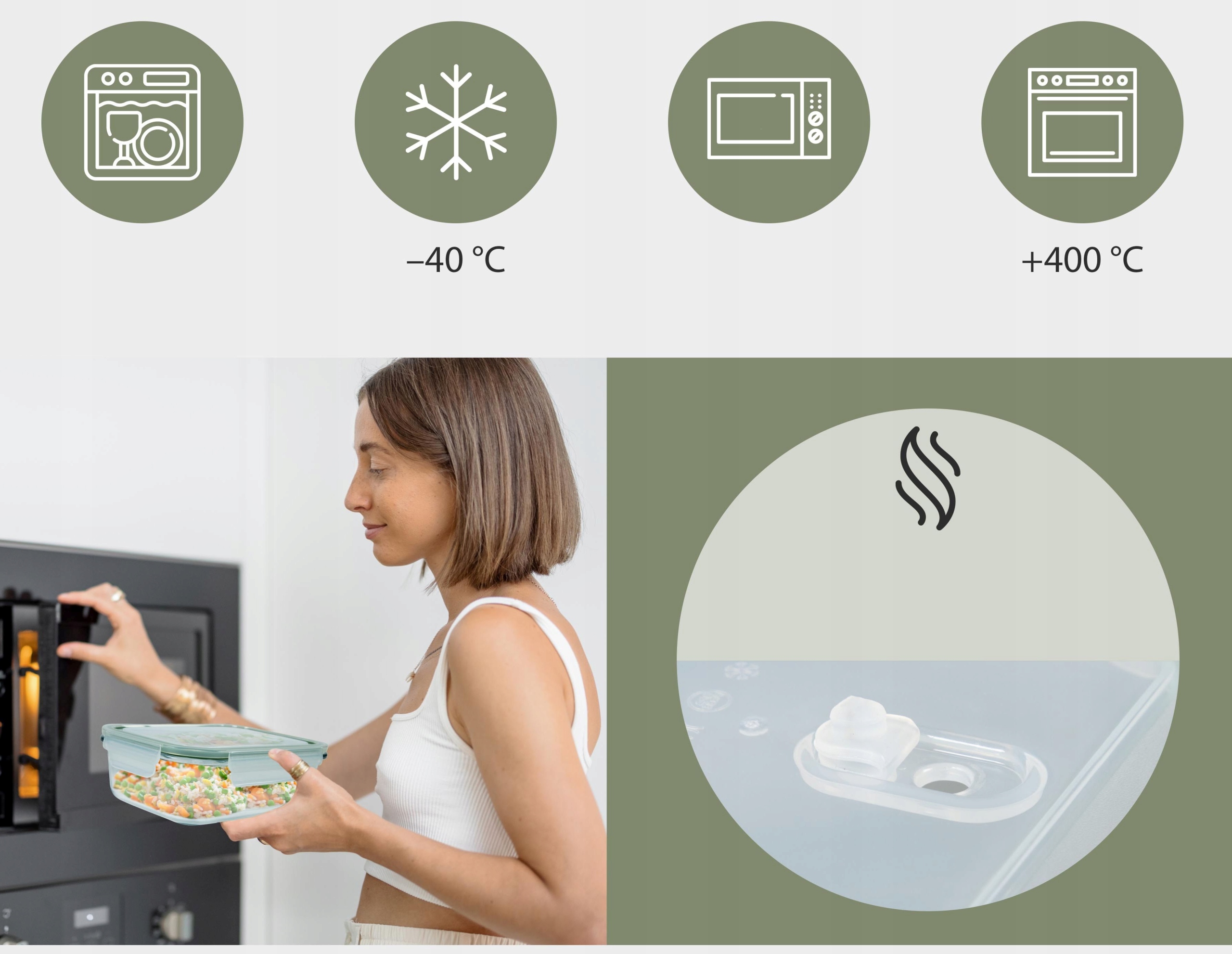 Чохли стійкі до температур від -40 до +110°C, а елементи зі скла -40 до +400°C. Тож ми можемо зберігати їх у морозильній камері, розігрівати в них їжу за допомогою мікрохвильової печі та, знявши кришку, навіть духовку!