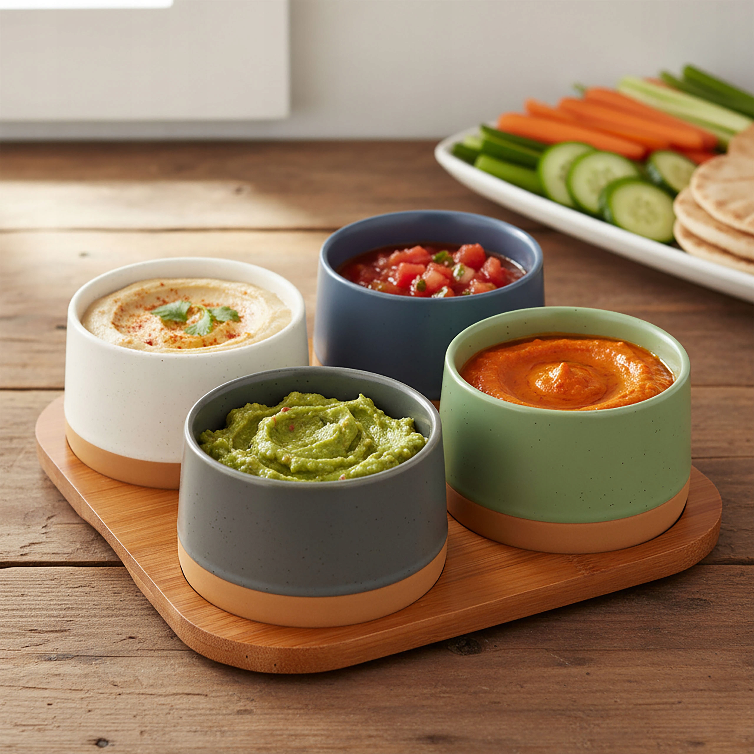 Елегантний набір з 4 керамічних мисок на темному бамбуковому підносі - це стильне і практичне рішення для подачі соусів, соусів, закусок і невеликих закусок. Чашки доступні в чотирьох різних кольорах: темно-синій, антрацитовий, кремовий і зелений з коричневою смугою біля основи. Бамбукова таця додає природного характеру та чудово виглядає на столі під час сімейних зустрічей і вечірок.