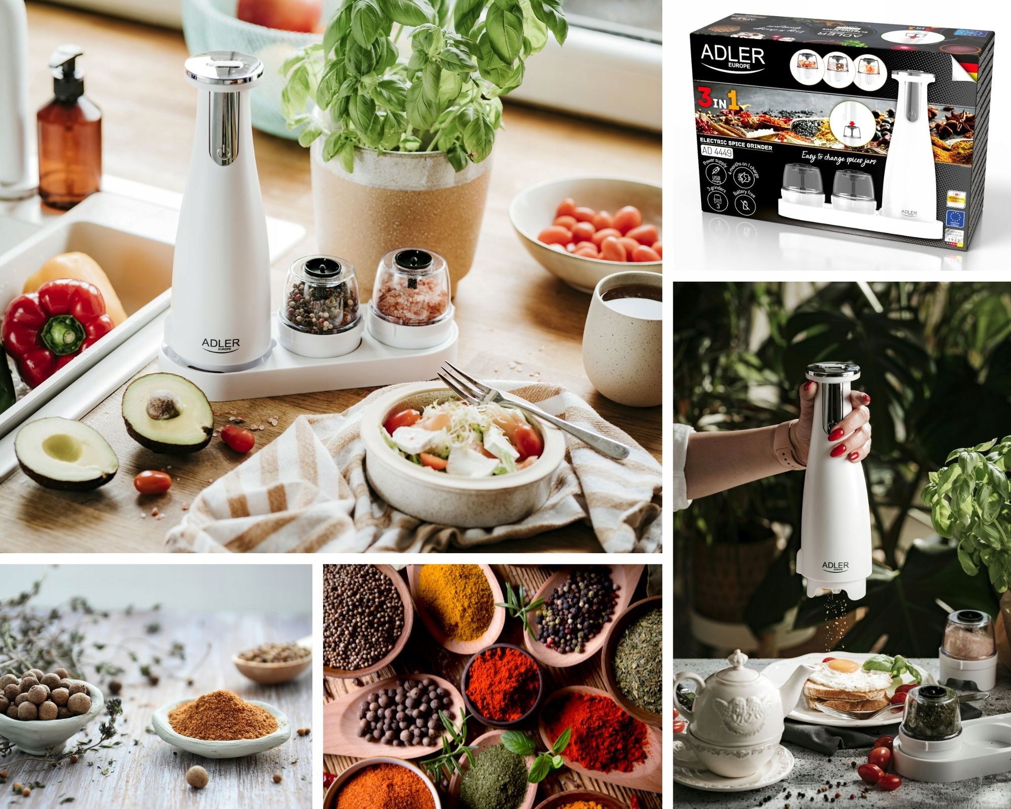 Продукт відрізняється інноваційною комбінацією трьох млинів у наборі. Електрична шліфувальна машина AD 4449 надзвичайно зручна і проста у використанні. Він також має кілька цікавих функцій. Наприклад, Ви можете вільно відрегулювати товщину шліфування спецій. у свою чергу, освітлена база сприяє контролю , де спрямовані і наскільки більше їх слід рухати. ємність однієї шліфування становить 150 мл , тому вам не доведеться турбуватися про їх регулярно. Ви завантажуєте пристрій кабелем USB, і через 2,5 години ви можете повністю використовувати його функцію. Немає нічого смачнішого, ніж свіжоземні спеції та трави.