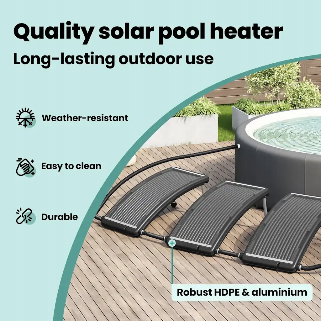 Нагрійте воду у вашому басейні за допомогою сонячної енергії за допомогою нашого сучасного набору сонячних водонагрівачів. Створено для продуктивності та довговічності з використанням високоякісних матеріалів, таких як HDPE, ПК та алюміній. Арочні панелі та регульовані ніжки забезпечують оптимальну орієнтацію на сонце та максимізують ефективність обігріву.