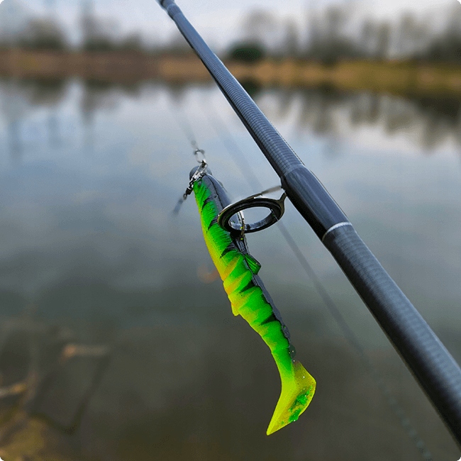 гумка вдаряє удар має унікальну моторику у воді , імітуючи природну поведінку живої риби . Це означає, що ці приманки надзвичайно ефективні для виклику реакції хижаків.