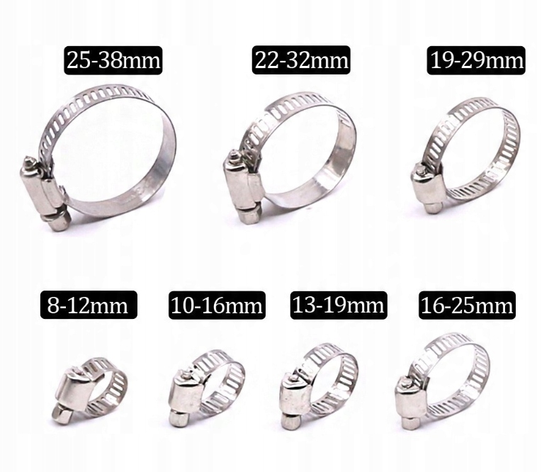 5. Діаметр шланга: 8-12 мм, 10-16 мм, 13-19 мм, 16-25 мм, 19-29 мм, 22-32 мм, 25-38 мм
