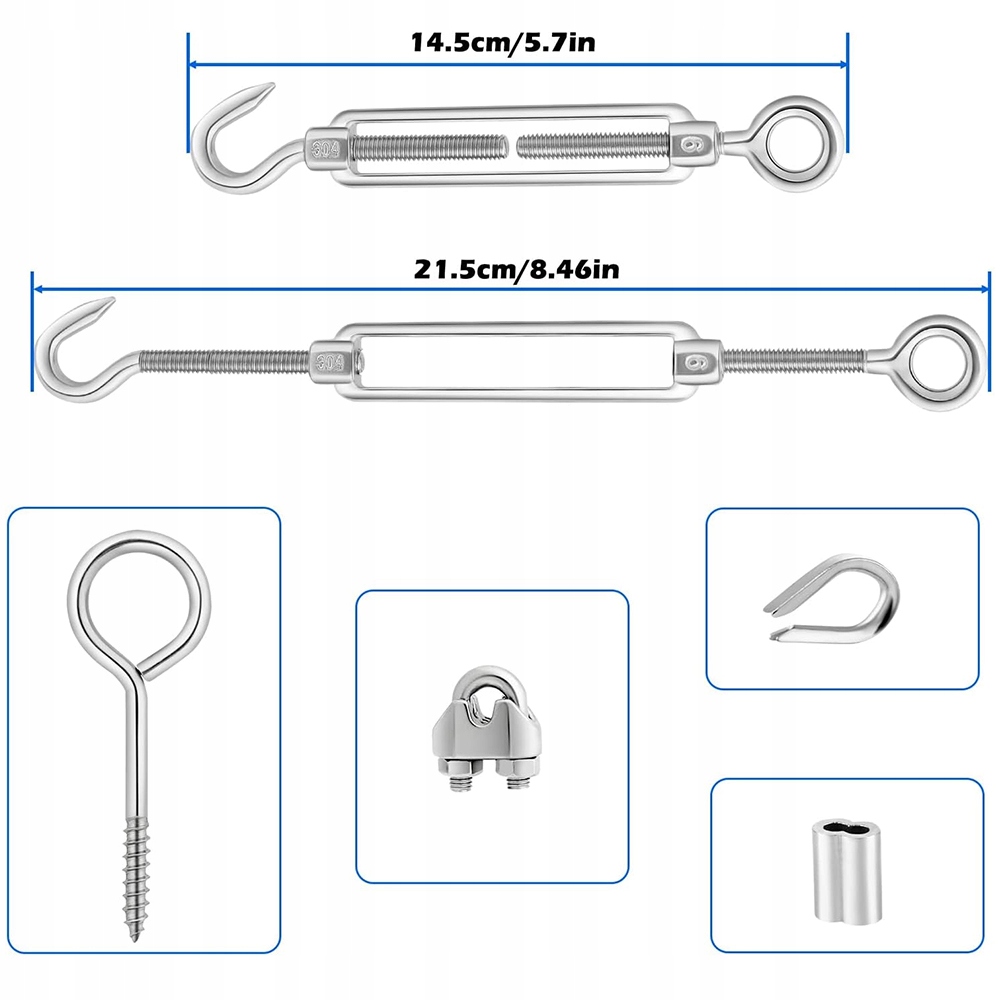 Набір стяжної муфти M6 для важких умов, повністю виготовлений із нержавіючої сталі 304. Покращені гайки M3 для затиску кабелю запобігають їх ослабленню, забезпечуючи міцніше утримання, ніж раніше. Стяжка M6 має широкий діапазон регулювань, що дозволяє натягувати трос для щільного і акуратного вигляду. Алюмінієві цанги забезпечують хорошу стійкість до корозії та іржі, тому їх можна використовувати за будь-яких погодних умов!