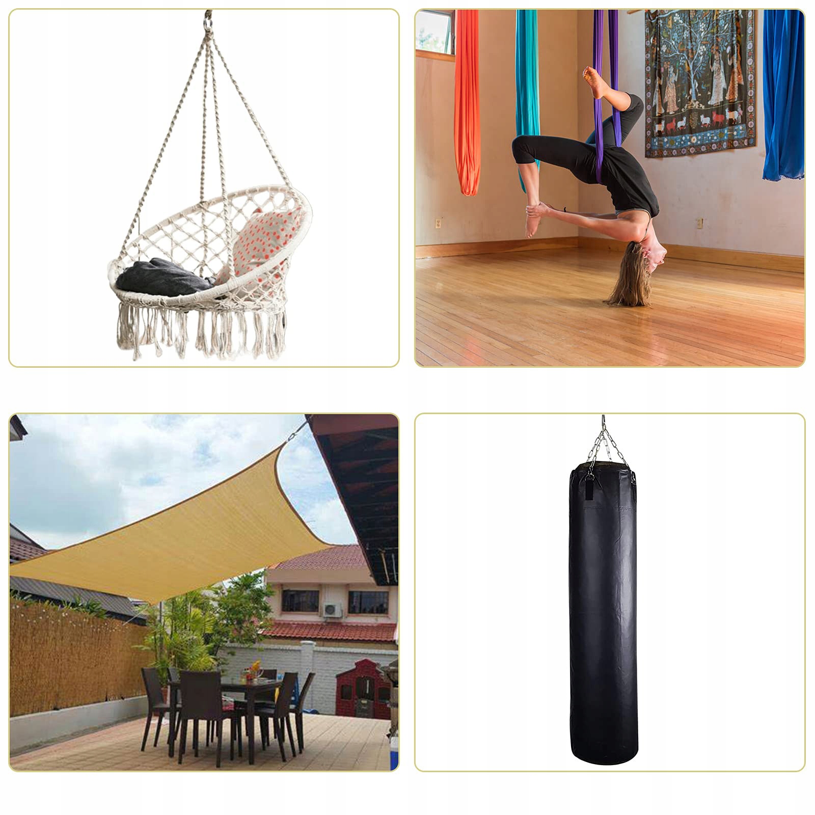 Можна використовувати для підвішування стільців, підвісних світильників, гамаків, боксерських мішків, ременів, рушників для йоги, тіньових вітрил, рушників для руки, підвісні стільці, підвісні стільці тощо.