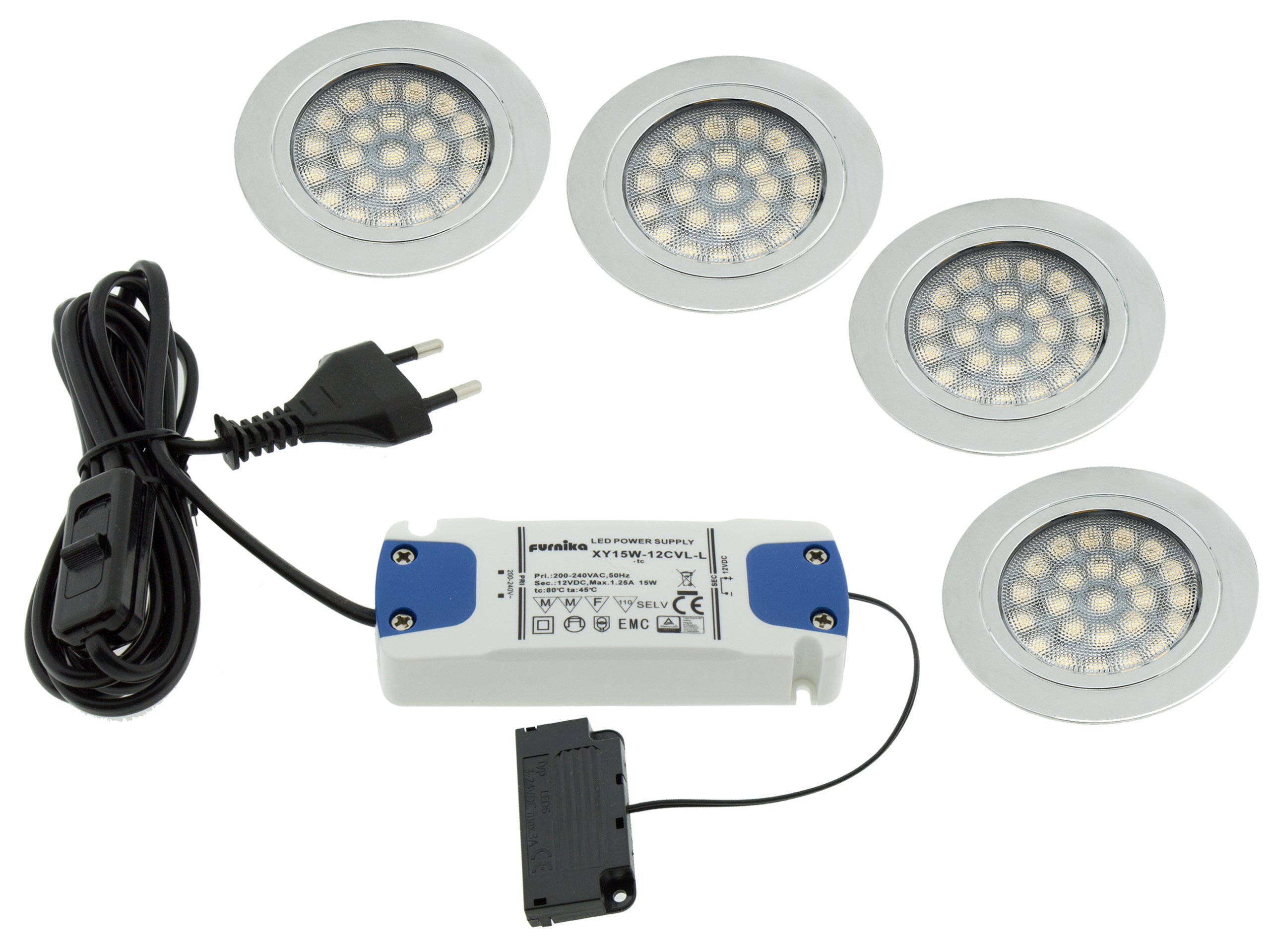 Набір світлодіодних світильників 4x ROUND з блоком живлення 15 Вт - це сучасне освітлювальне рішення для вбудованих меблевих щитів, оснащених світлодіодами.
