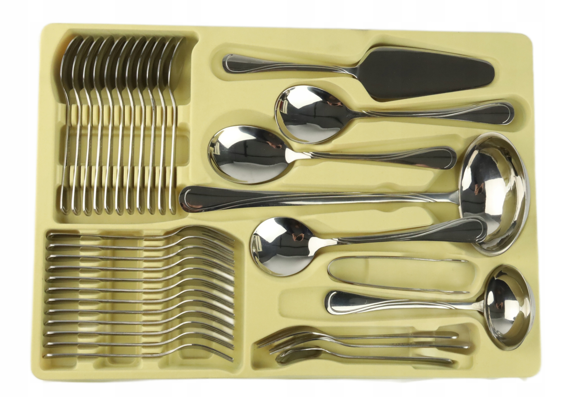Кожен елемент набору розроблено з урахуванням зручності використання. Столовий прилад має закруглені кінці та прикрашений тонким двосмужковим гравіюванням уздовж ручки, що додає елегантності. Їх відповідна вага забезпечує хорошу стійкість у руці, а міцність матеріалу захищає від деформації навіть під час інтенсивного використання.