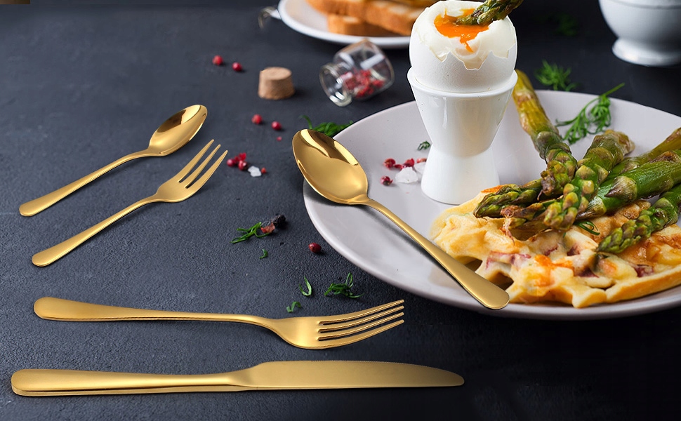 🍽️【Золотий набір】: 6 шт. столові ножі 6 шт. ложки обідні, 6 шт. столові вилки, 6 шт. чайних виделок і 6 шт. чайні ложки