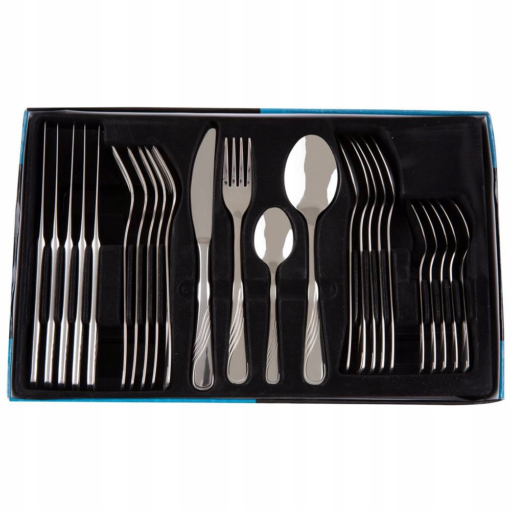 Набір столових приборів на 6 осіб виготовлений з високоякісної нержавіючої сталі з високою стійкістю до корозії. Столові прибори чудової форми та збалансованої форми мають витончений малюнок, який підкреслює обтічні форми ножів, ложок, виделок і чайних ложок.