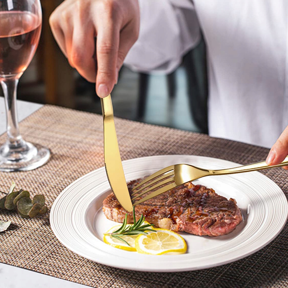 Цей золотий набори столових приладів містить 24 штуки, ідеально підходить для 6 осіб, включаючи ножі стейк, вилки, ложки та чайні ложки. Набір упакований у подарункову коробку і чудово виглядає як для повсякденного використання, так і як подарунок.