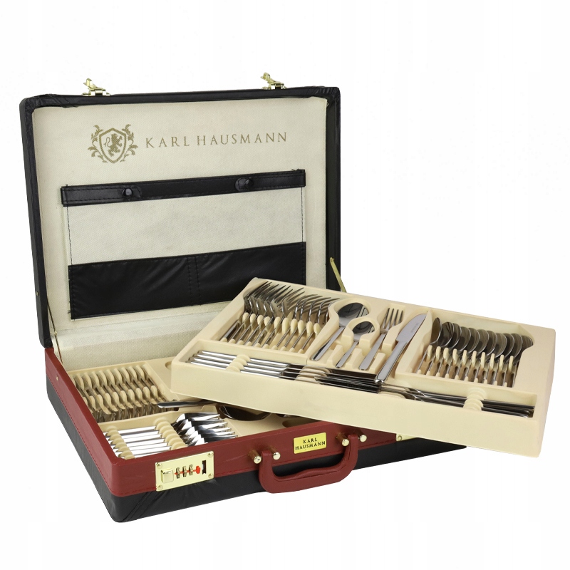 Набір столових приборів із 72 предметів, виготовлений із високоякісноїнержавіючої сталі. Набір столових приборів на 12 персон зробить Ваш стіл надзвичайно стильним та елегантним. Все це упаковано в елегантну валізу з екологічної шкіри, яка захищає столові прилади від зовнішніх факторів навколишнього середовища, що значно полегшує зберігання та транспортування всіх елементів набору.