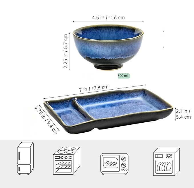 - Японський дизайн - насолоджуйтесь смачним та автентичним смаком свіжих суші з східного, поданого в традиційному японському стилі. Наша реакційна плитка має унікальний, чудовий синій відтінок, який не тільки підкреслює смак страв, але й підкреслює ваші унікальні кулінарні навички. Крім того, це додасть трохи витонченості вашій стільниці або столу в їдальні та збагатить кулінарний досвід. 4 Він містить усе, що потрібно для ідеальної вечері для одного -двох людей. Набір складається з двох азіатських чаш з рисом/супами, двох суші -тарілок. Завдяки цьому повному посуду ви можете насолоджуватися розкішним кулінарним досвідом, як у найкращому азіатському ресторані, не виходячи з дому.