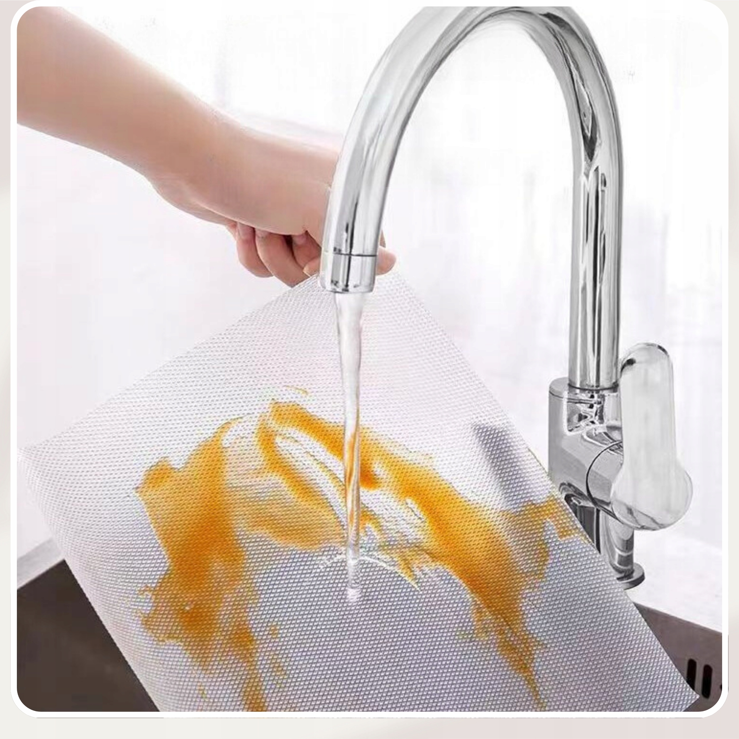 Килимок дуже легко чистити - просто протріть його вологою ганчіркою або промийте водою. Ви також можете помити його в раковині, використовуючи м’який миючий засіб, якщо потрібно.