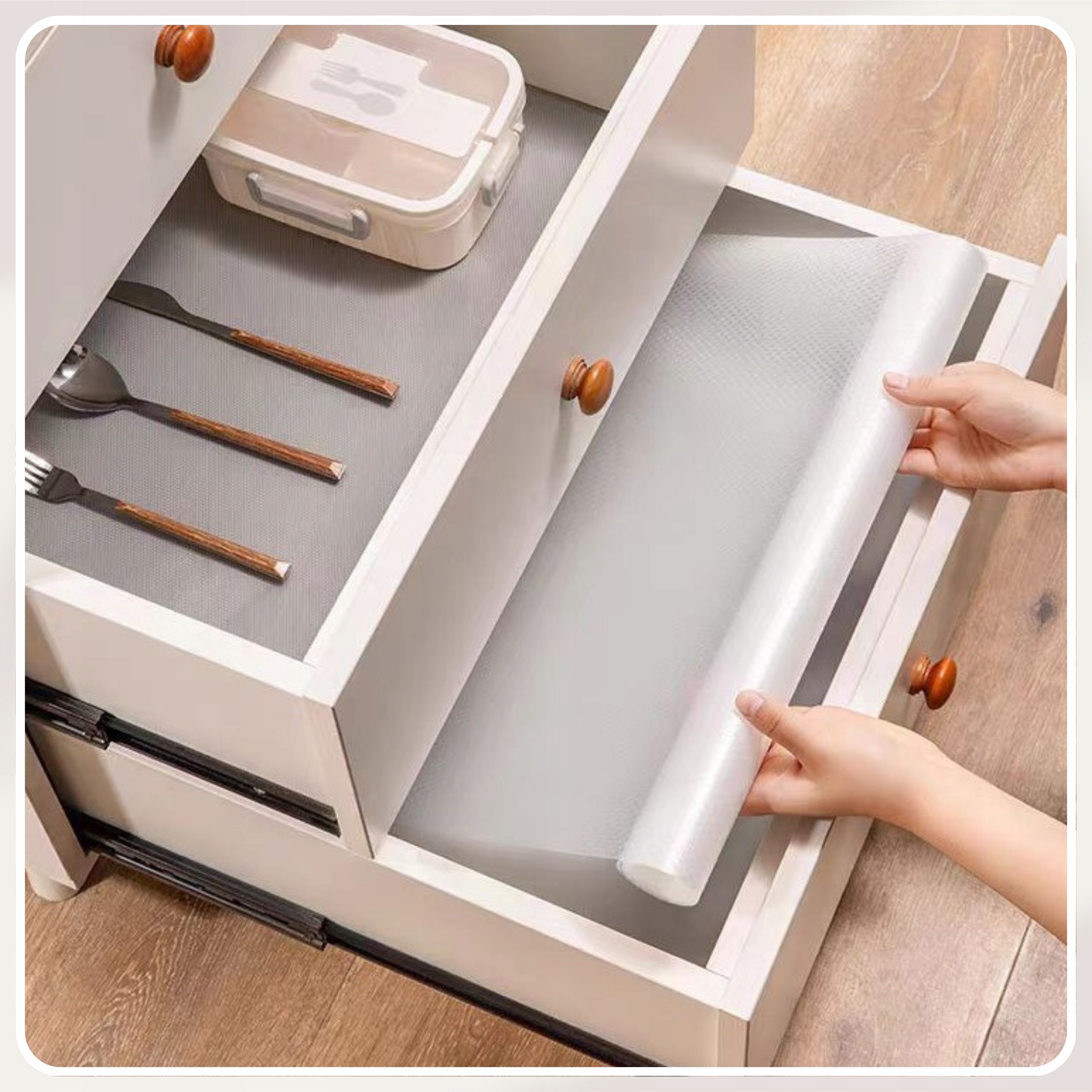 Протиковзкий захисний килимок для ящиків і шаф - це практичне рішення, яке забезпечує захист поверхні та стійкість предметів, що зберігаються. Завдяки йому ящики та полиці в шафах залишаються чистими та без подряпин, а розміщені на них посуд, кухонне приладдя та інші предмети не рухаються при відкриванні та закриванні.