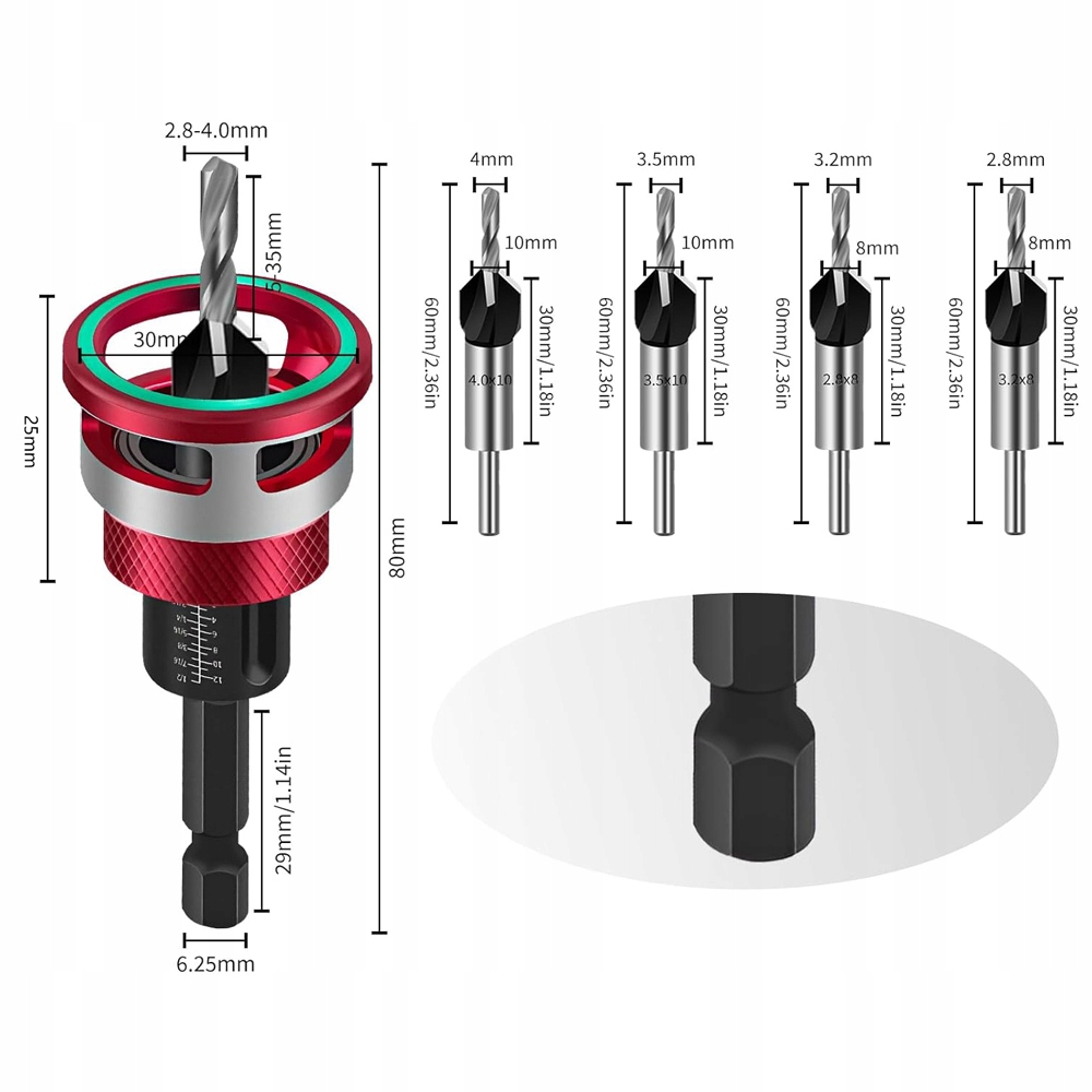 • 🛠️ Набір 4 в 1: Чотири розміри свердла (2,8, 3,2, 3,5, 4,0 мм) із вбудованими напрямними 82° - a готове рішення прямо з коробки.