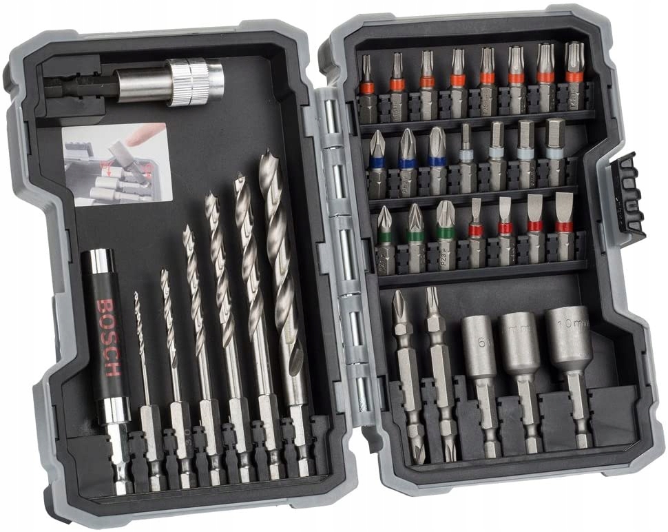Набір свердел і біт для викруток (35 шт.) підходить для універсального застосування. Включає набір аксесуарів для свердління та загвинчування. Насадки для викруток, виготовлені з модифікованої сталі S2, пройшли оптимізовану термічну обробку, що забезпечує їх виняткову довговічність і ефективність під час будь-яких робіт. Вузька торсіонна зона легко справляється з піками крутного моменту, поглинаючи силу та вібрацію під час затягування болтів. Біти мають кольорове кодування для зручності перегляду та вибору. Крім того, в комплект входять свердла HSS, розроблені для довговічності при роботі з дерев'яними матеріалами. Мають зовнішній шестигранний тримач 1/4 дюйма для викруток і викруток.