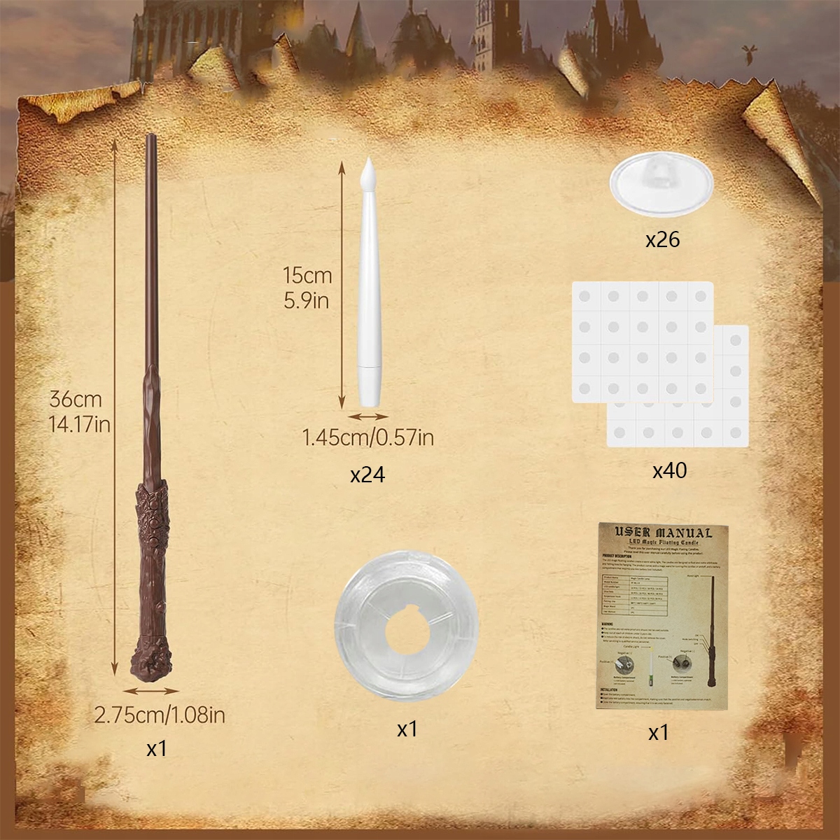 ✴️Цей ексклюзивний набір включає 24 плаваючі свічки, 1 пульт дистанційного керування чарівною паличкою, 26 рибальських гачків (2 запасних), 40 наклейок, 50 м волосіні та 1 посібник користувача. Безполум'яні свічки з дистанційним керуванням упаковані в елегантну подарункову коробку - ідеально підходять для дітей, підлітків і молодих душею. Ідеально підходить, щоб привнести романтику та магію в повсякденне життя.
