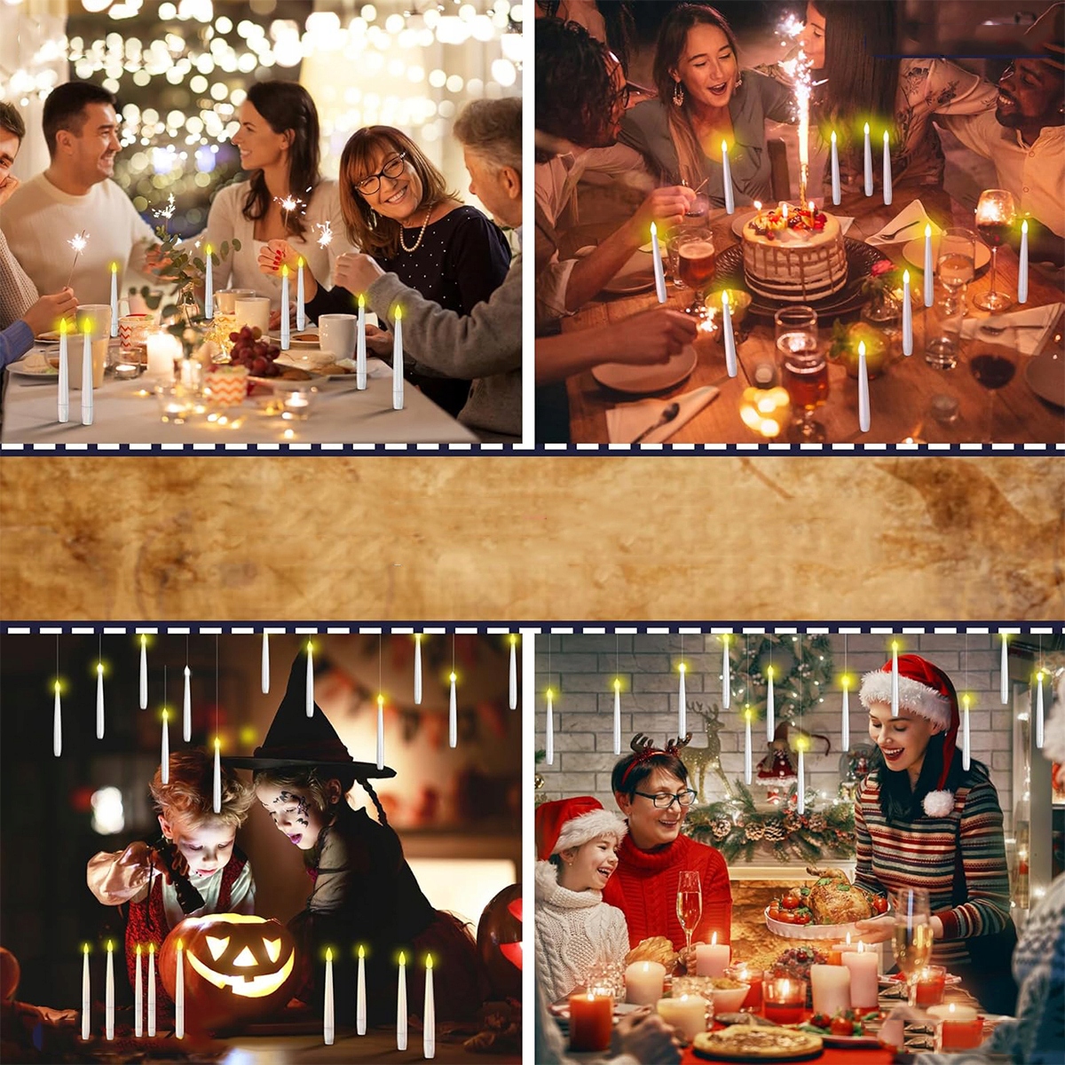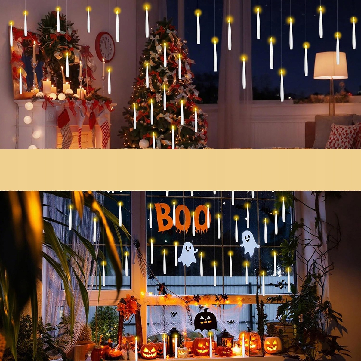 ✴️ Стильні світлодіодні свічки, що випромінюють тепле світло, створюють неповторну атмосферу в будь-якому інтер'єрі. Підвішені на мотузках, вони ніби парять, а ручка керування паличкою додає їм чарівного характеру — ідеально підходить для свят, вечерь, фотосесій або атмосферних декорацій на Хелловін.Легкі, безпечні та багаторазові — без вогню, без кабелів, без ризику.