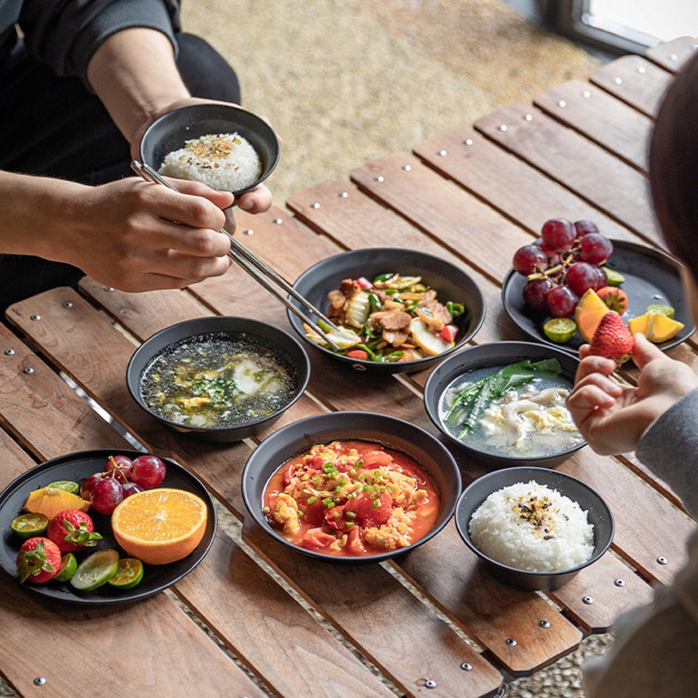 - Цей набір столу на вулиці включає чаші з супом, чаші з рисом, тарілку, фруктову тарілку та сумку для зберігання, що робить його легким для носіння та ідеально підходить для їдальні на вулиці. Виготовлений з нержавіючої сталі з покриттям Ti, вона не легко деформована, стійкий до тепла і легко мити.