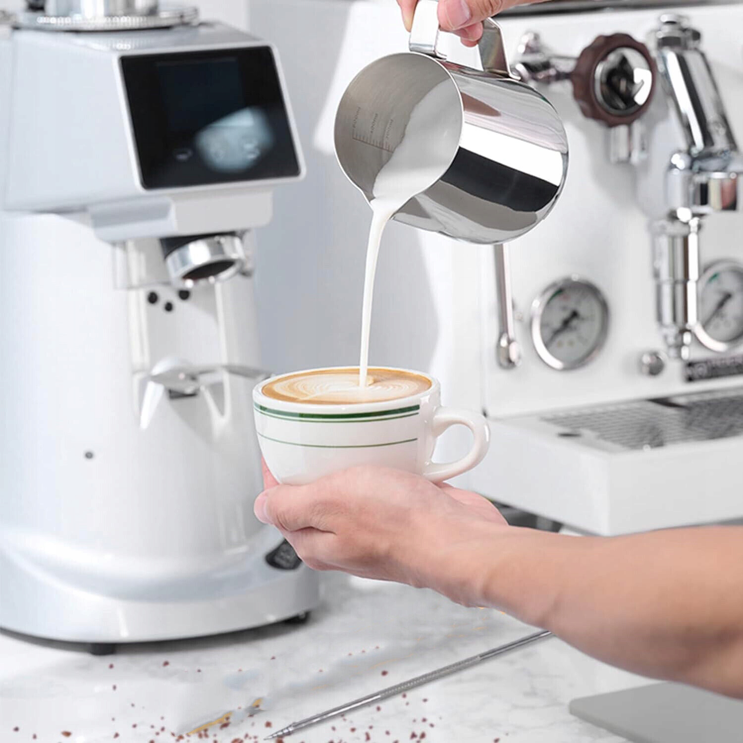 Молочник з нержавіючої сталі (350 мл) має накип всередині він міцний, стійкий до іржі та його можна мити в посудомийній машині. Силіконовий килимок для збивання запобігає руху портафільтра під час збивання та захищає стільницю та портафільтр від пошкоджень. Професійна латте-арт ручка дозволяє створювати гарні візерунки на каві. Декоративні трафарети пропонують великий вибір мотивів і виготовлені з міцного пластику.