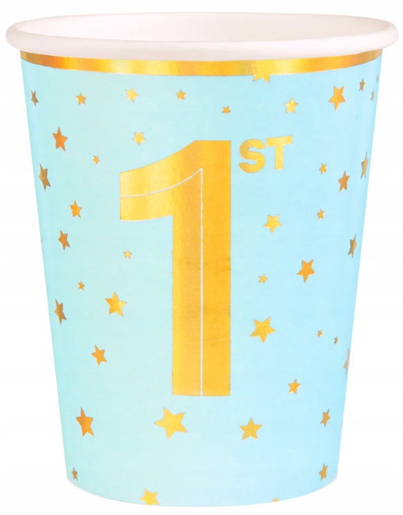 - Паперові стаканчики: У набір також входить 12 синіх стаканчиків ємністю 220 мл, також прикрашених золотими зірочками і елегантна цифра «1». Ідеально підходить для подачі напоїв, таких як соки чи лимонад, з унікальним різдвяним акцентом.